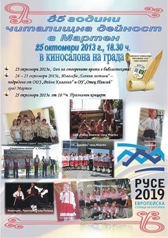 На 25 октомври от 18.30 ч., в киносалона в Мартен ще се проведе празничен концерт по случай 85г. от създаването на Народно читалище „Просвета 1928г.” В празненството ще вземат участие състави от града, танцова формация „Лудогорие” от Разград и „Сандровските момци” от село Сандрово. В концерта ще бъдат изпълнени народни танци, песни и обичая „Вадене на мръви”, който се пресъздава само в град Мартен.