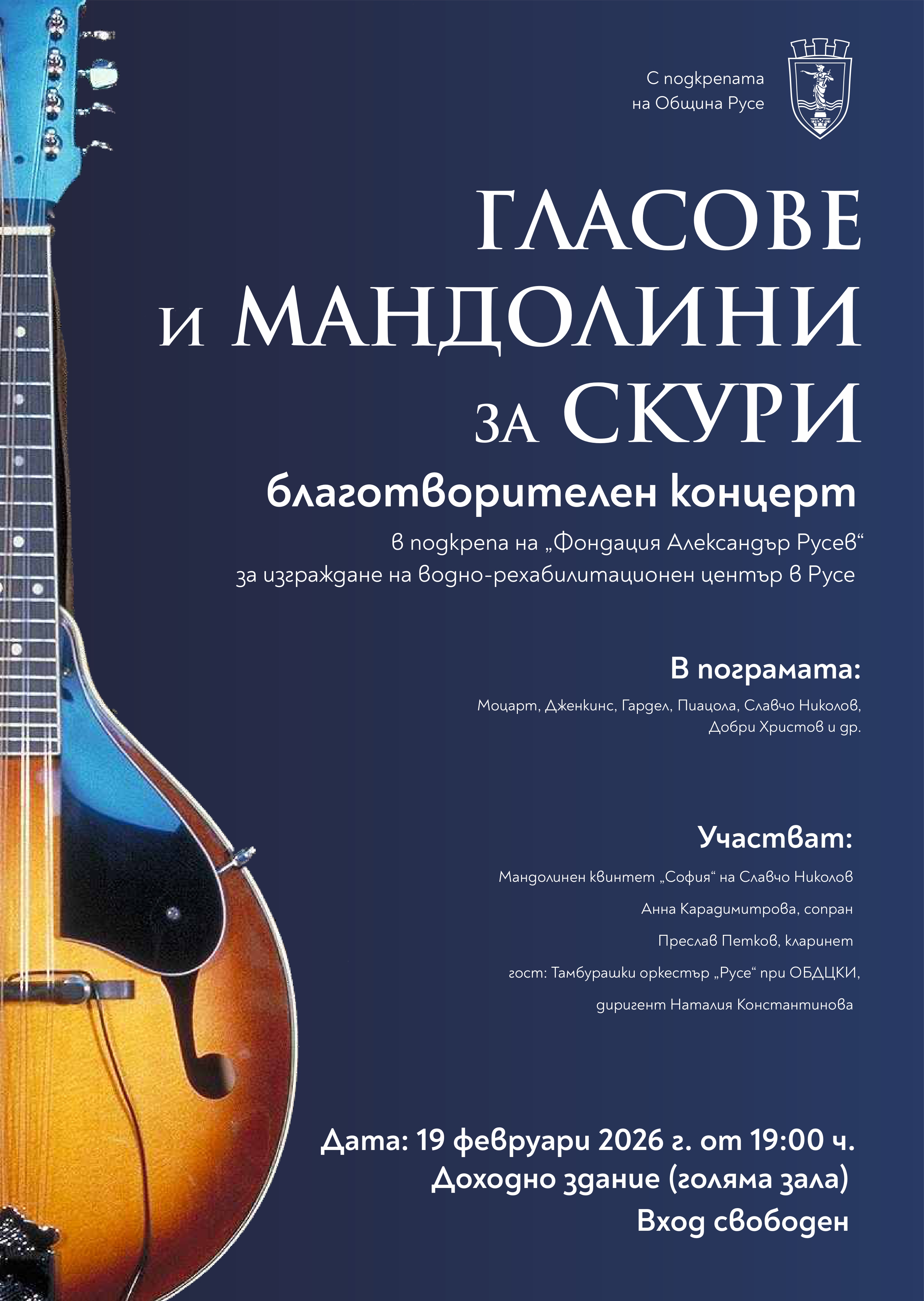 На 19 февруари /четвъртък/ от 19 ч. в Голямата зала на Доходното здание ще се проведе благотворителният концерт „Гласове и мандолини за Скури“. Събитието е посветено на каузата за изграждане на водно-рехабилитационен център за деца и възрастни с ментални и физически затруднения.