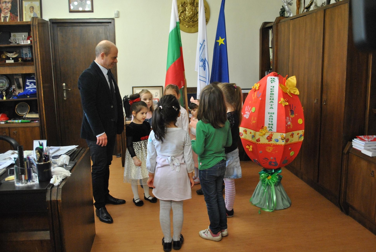 Деца от ЦДГ „Червената шапчица“ в Русе гостуваха днес на кмета Пламен Стоилов. С пожелание за много здраве и благодат в Общината, малчуганите му подариха огромно великденско яйце, боядисано и украсено от самите тях. Децата пяха песни и рецитираха стихове, посветени на най-светлия християнски празник Великден.