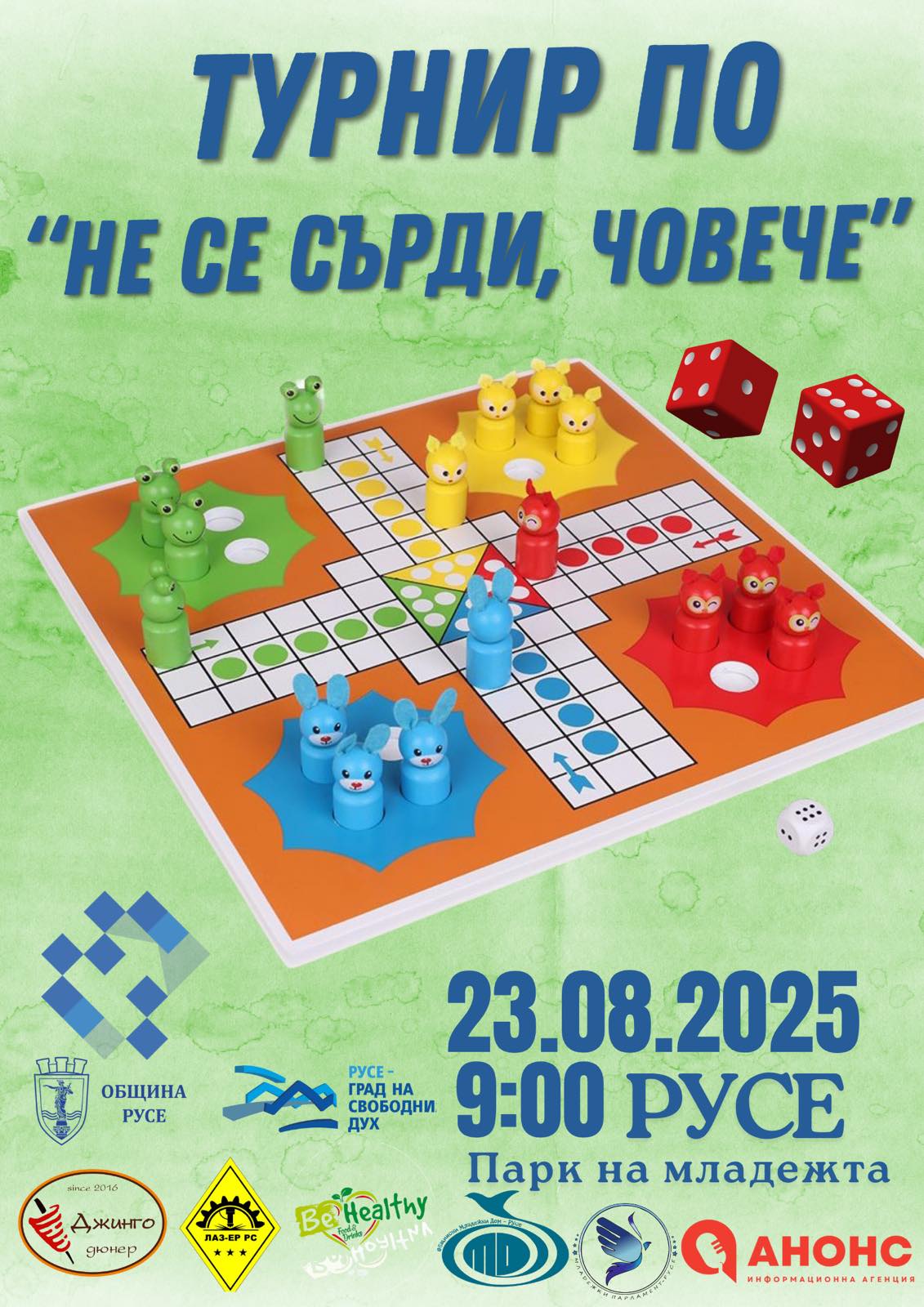 The charity tournament "Don't Get Angry, Man" will be held on August 23 (Sunday) at 9 a.m. in the Youth Park, Prista Alley. The event is organized by the Napred Association with the support of the Ruse Municipality and the Ruse - City of the Free Spirit Foundation.