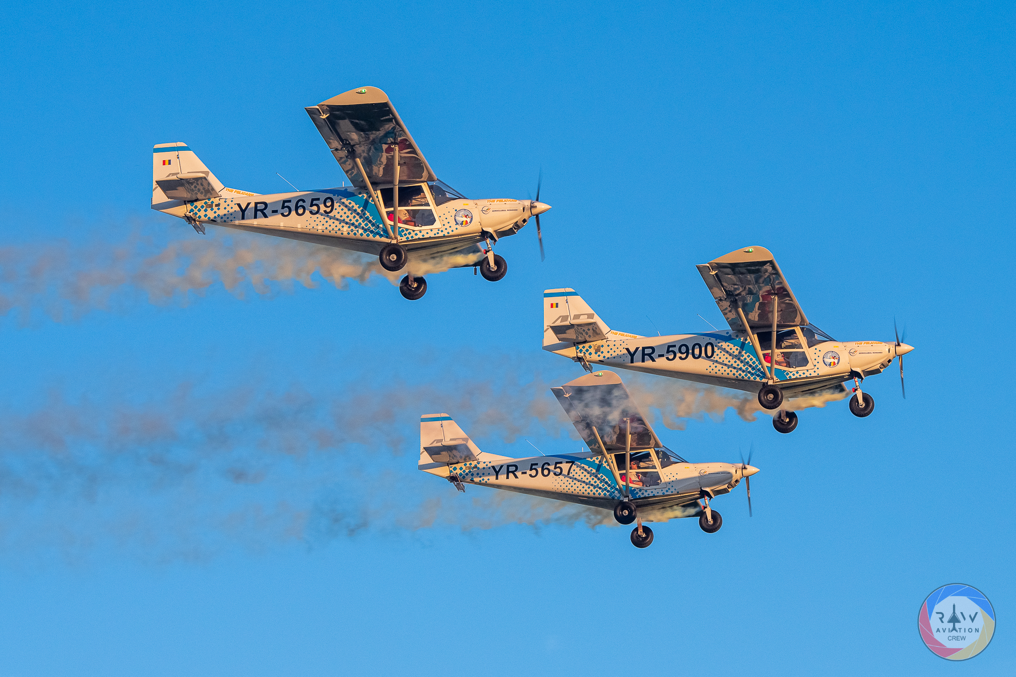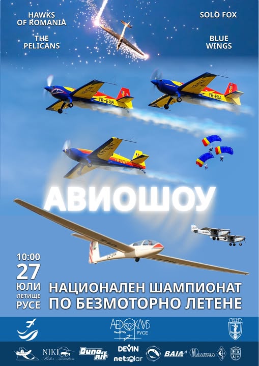 At 10:30 a.m., the audience will have the opportunity to see a flight of a configuration of an airplane tow with a Bulgarian glider, followed by a jump with the Bulgarian flag, which will be flown by the only Bulgarian among the parachutists. From 10:40 a.m., the show continues with the impressive program of the Romanian aerobatic groups and parachutists. Hawks of Romania will present an aerobatic group with Extra 300L and Extra 330SC aerobatic aircraft, while The Pelicans will demonstrate their skills with Savannah S ultralight aircraft. The program also includes MDM SOLO FOX with a demonstration aerobatic flight with a glider and a Maule M7 towing aircraft, as well as Blue Wings Romania with a demonstration parachute formation.