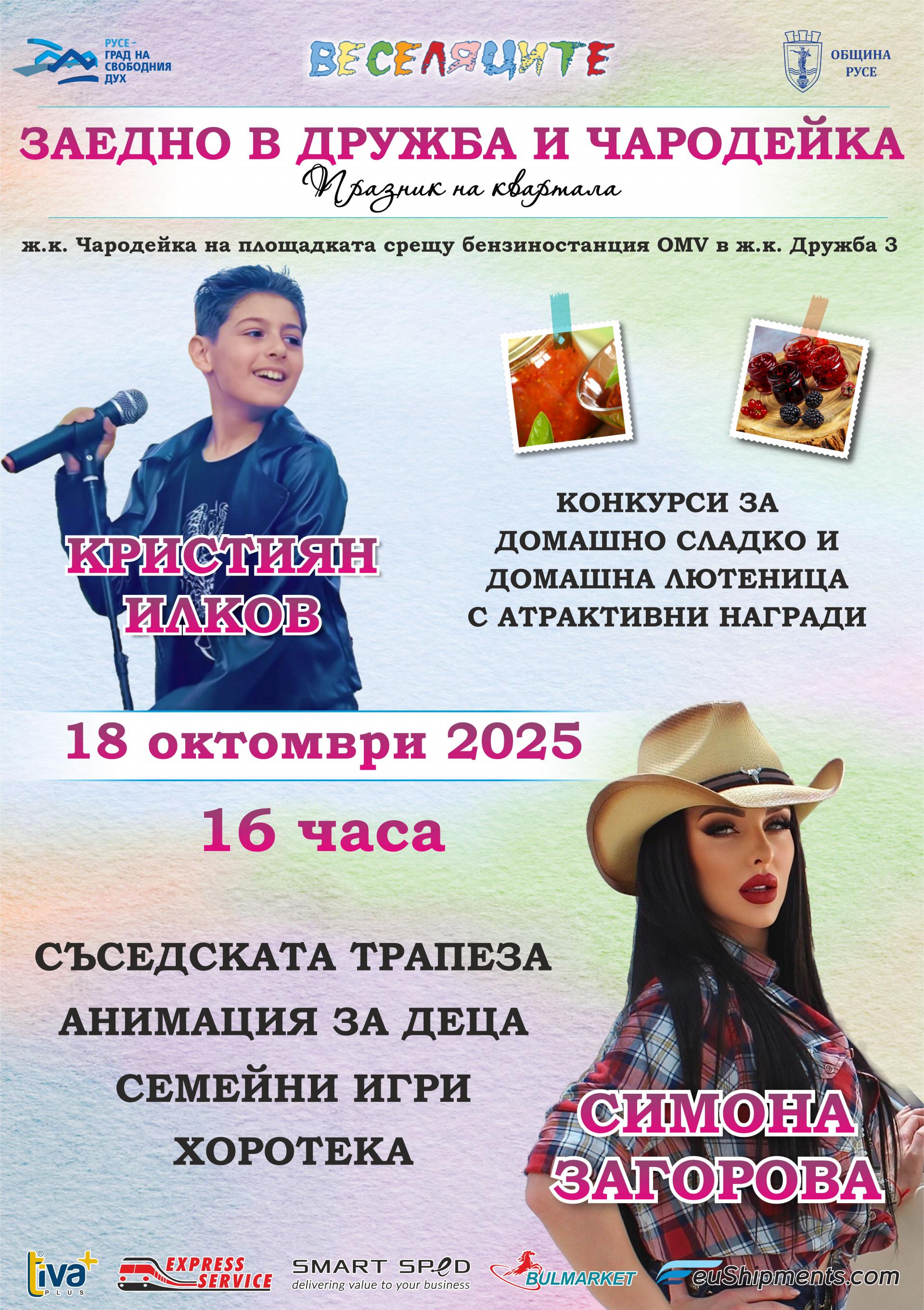 On October 18 /Saturday/ at 4 p.m., residents of the "Druzhba" and "Charodeyka" neighborhoods will gather together to celebrate their "Neighborhood Holiday" under the motto "Together in Druzhba and Charodeyka". The initiative is organized for the sixth consecutive year by the Municipal Foundation "Ruse - City of the Free Spirit" with the support of "Tiva Plus", "Smart Speed", "Express Service", "Bulmarket CNG". The event will be held in the open space next to block "112" in the "Charodeyka - South" neighborhood.