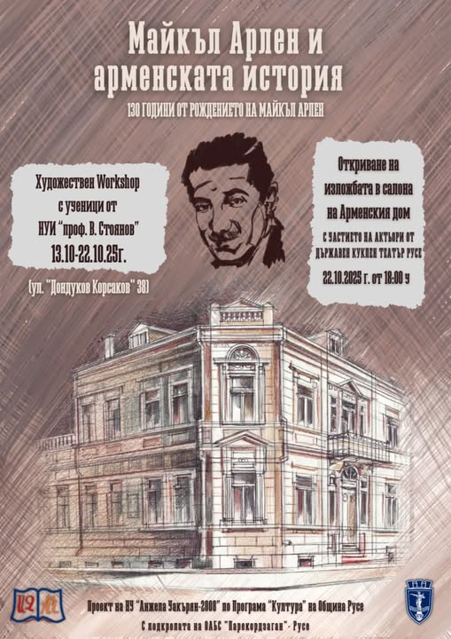 On October 22 /Wednesday/ at 6 p.m., an exhibition will be opened in the courtyard of the Armenian House, marking the 130th anniversary of the birth of the world-famous writer Michael Arlen, born in Ruse. The event marks the end of the activities under the project "Michael Arlen and Armenian History", implemented by the "Angela Chakaryan" Public Foundation with the financial support of the "Culture" Program.