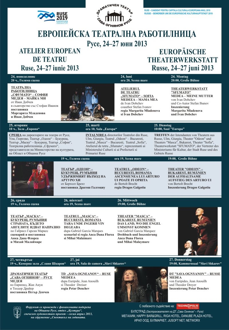 Начало на форума ще постави спектакълът „Медея – майка ми“ на Театрална работилница „Сфумато“, който ще се играе на 24 юни (понеделник) в Голямата зала на Доходно здание. Европейската театрална работилница ще продължи до 27 юни.