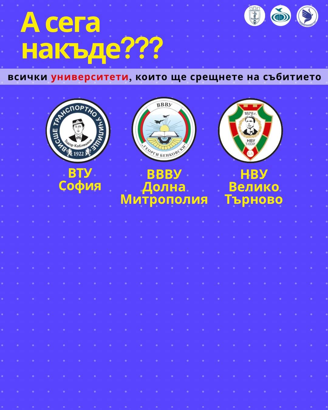 Проявата включва образователно експо, в което ще участват 22 университета от цялата страна. Представители на висши учебни заведения ще бъдат разположени във фоайетата на Доходното здание, където ще представят своите специалности, условия за кандидатстване и възможности за развитие.