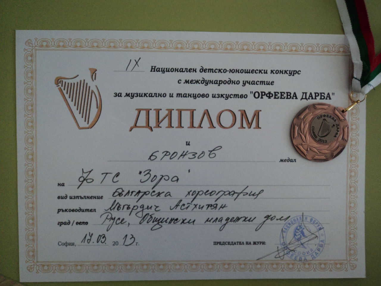 Танцьорите от Фолклорна танцова студия „Зора” към Общински Младежки дом Русе участваха в националния фолклорен конкурс „Орфеева дарба”, който се проведе през изминалият уикенд в София. В конкурса участваха състави от цялата страна – София, Пловдив, Варна, Русе и др. Те бяха разделени в няколко възрастови групи, като всеки състав представи по два танца в рамките на 15 минути. В оспорвана надпревара с танцьори от любителски и професионални групи, русенските младежи от ФТС „Зора” с ръководител Мъгърдич Астхигян успяха да завоюват призовото трето място в конкурса и да получат бронзов медал и грамота.