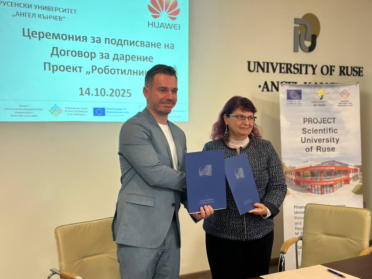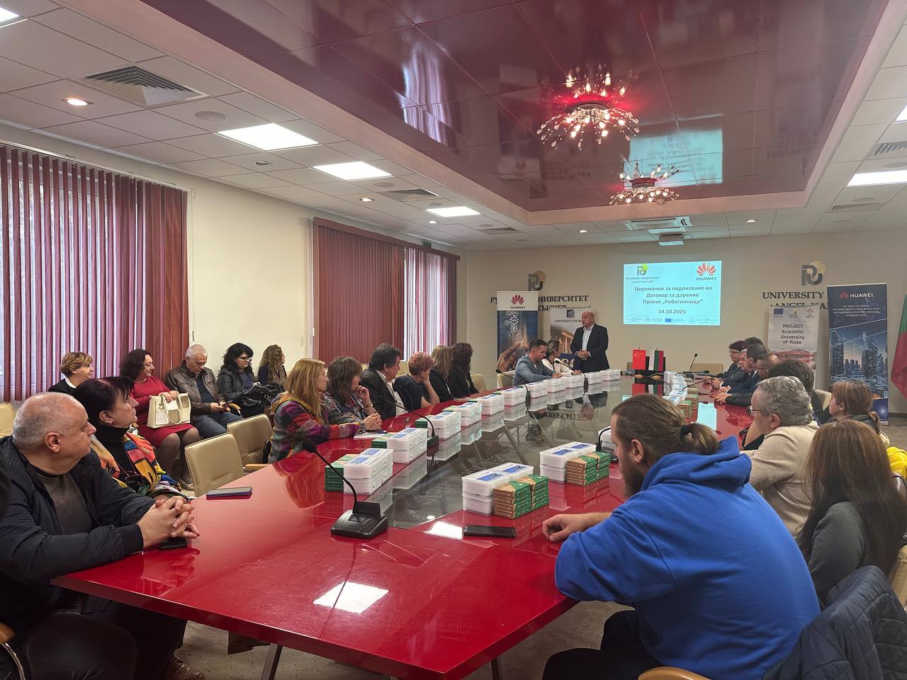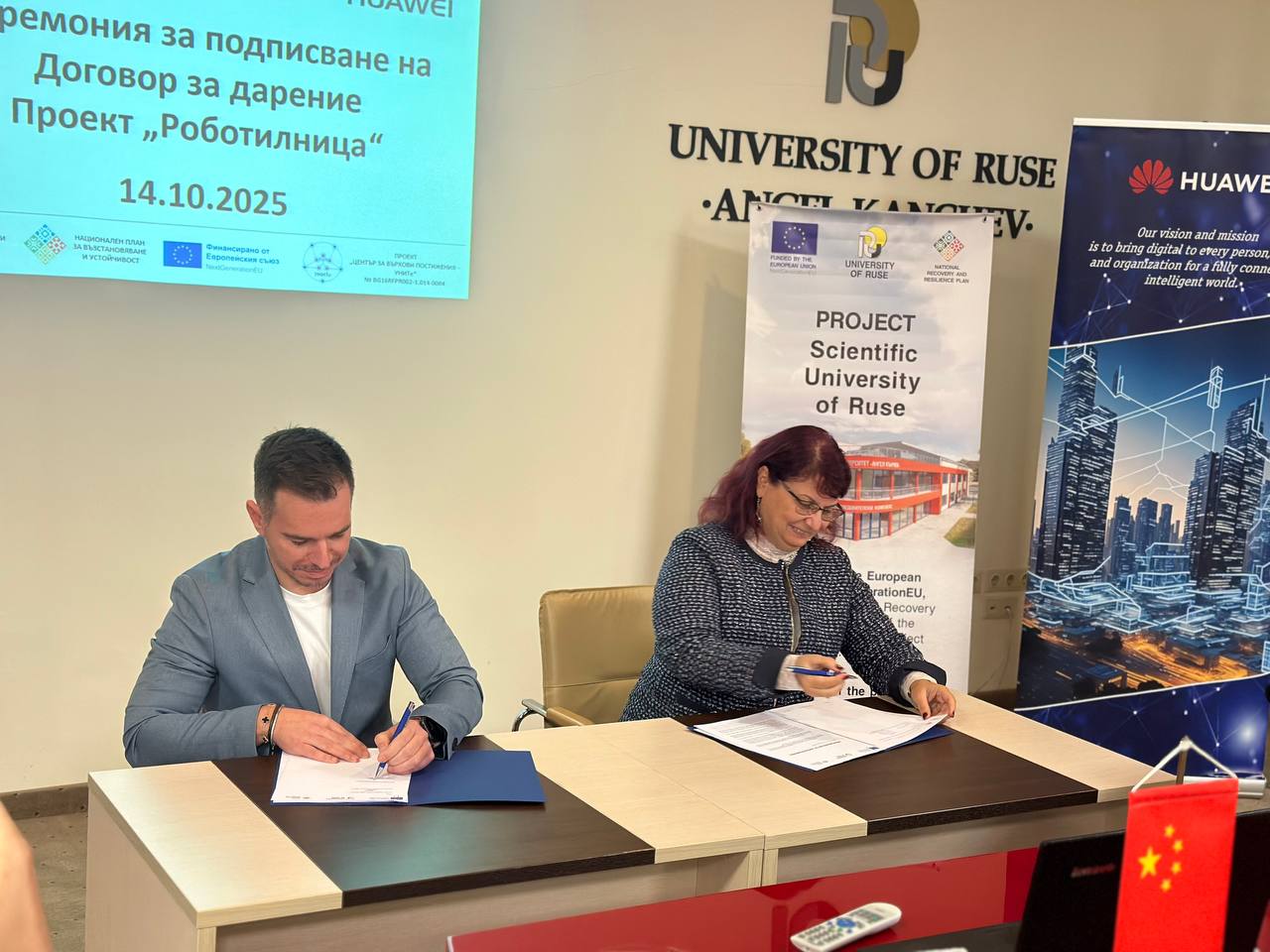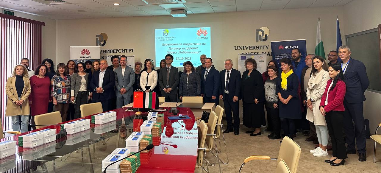 В Канев център днес се състоя церемония по предаване на дарение от „Хуауей Технолоджис България“ за всички училища на територията на община Русе. Ректорът на Русенския университет доц. д-р Десислава Атанасова и заместник-директорът на отдел "Корпоративни партньорства и обществени инициативи" на компанията Руслан Цанков подписаха меморандум за сътрудничество. 22 учебни заведения получиха оборудване по проект „Роботилница“, по който ученици от трети и четвърти клас ще се включат в специални работилници, където ще научат как да сглобяват и програмират роботи. Специален гост на събитието бе кметът Пенчо Милков, който изказа благодарности към представителите на „Хуауей Технолоджис България“ за сътрудничеството, което по неговите думи сбъдва мечти.