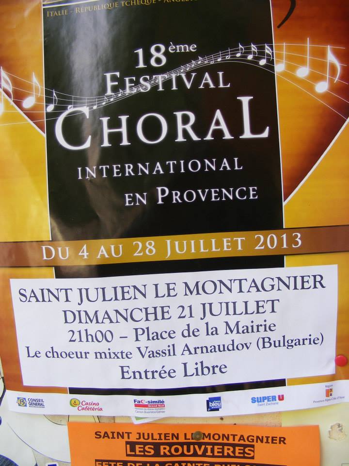 Хор “Проф.Васил Арнаудов”, първият русенски посланик в тазгодишната Европейска столица на културата - Марсилия, се завърна след успешно представяне на 18-ия Международен фестивал на хоровата музика на Прованс. Певческият състав, с диригент Драгомир Йосифов, замина по специална покана на организаторите на фестивала, провел се във френския град Марсилия и неговите околности.