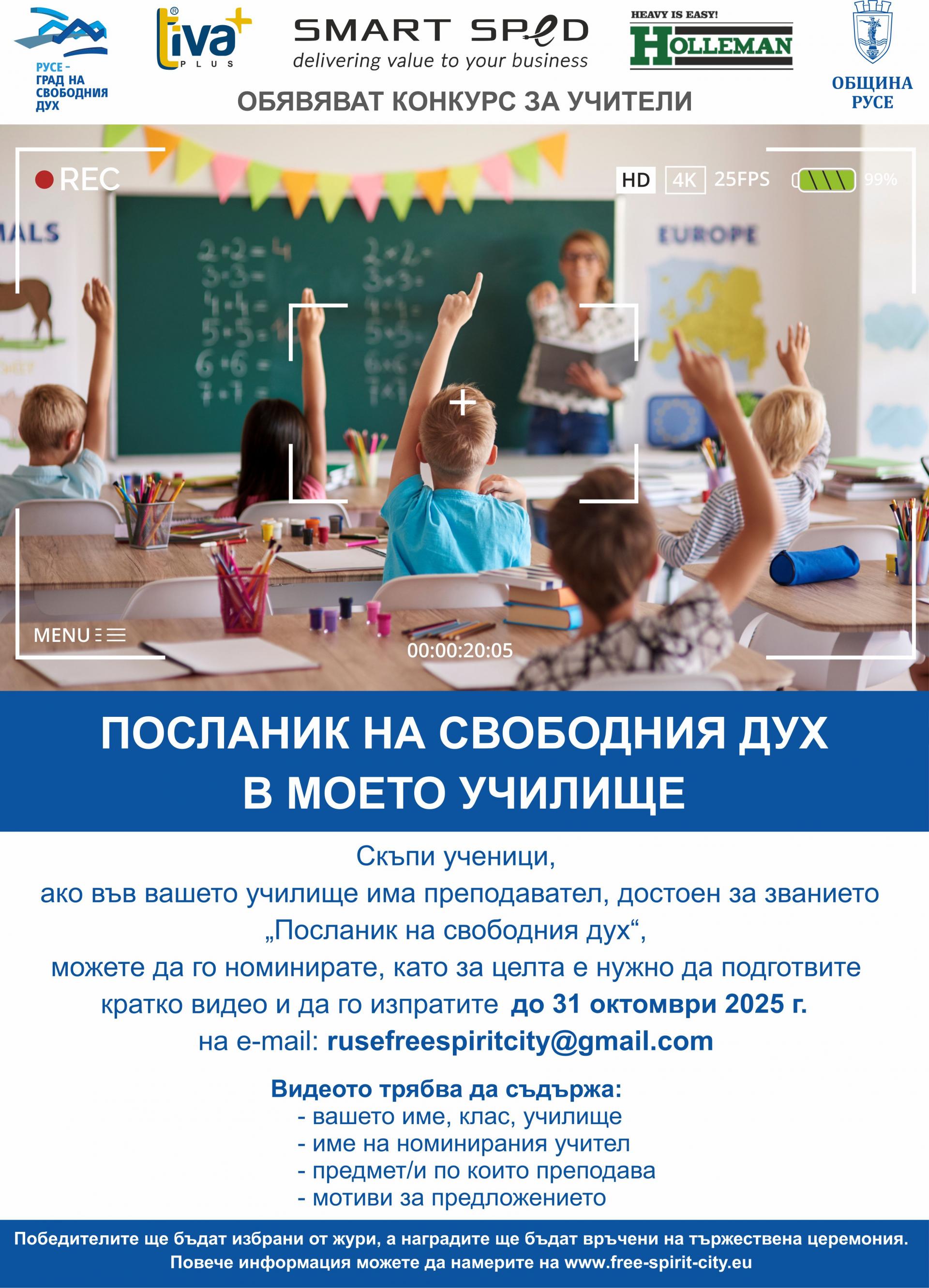 За 12-а поредна година Общинска фондация „Русе – град на свободния дух“ обявява конкурс за учители „Посланик на свободния дух в моето училище“. Инициативата е посветена на съвременните будители и се реализира с подкрепата на „Тива Плюс“, „Смарт Спед“ и „Холеман България“.