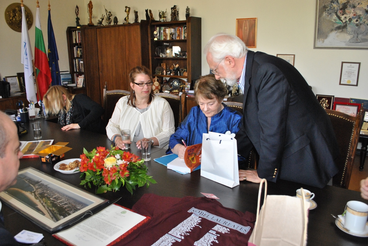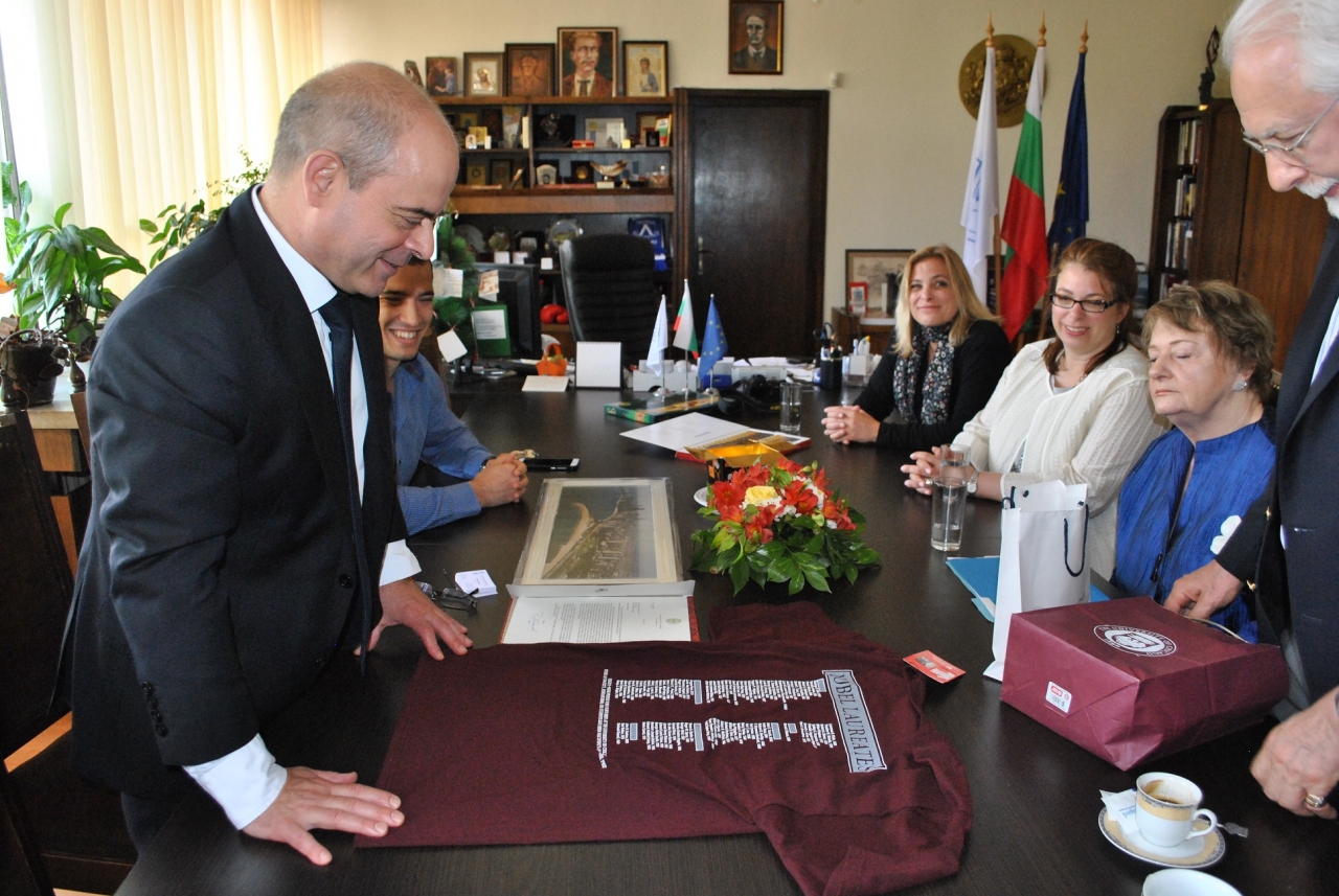Освен писмото, проф. Рефетов поднесе на русенския градоначалник и снимка от Чикаго, както и тениска на Чикагския университет, на гърба на която са изписани имената на всички нобелови лауреати на висшето учебно заведение. Съпругата на проф. Рефетов – Хедър Рефетов поднесе на кмета Пламен Стоилов последната си издадена книга с автограф и посвещение.