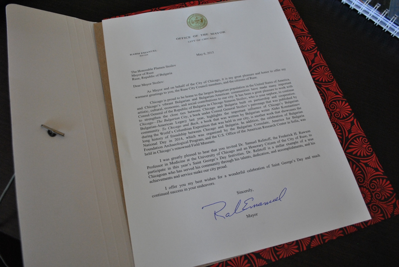 „Особено много се зарадвах да разбера, че сте поканили д-р Самуил Рефетов, професор по медицина в Чикагския университет и почетен гражданин на град Русе, да участва в тазгодишния фестивал за Деня на Св. Георги. Д-р Рефетов е блестящ пример за истински чикагски гражданин, който е служил на обществото си чрез своя талант, отдаденост и постижения, и неговите постижения и дейност ни карат да се чувстваме горди. Моля да приемете моите най-добри пожелания за едно чудесно празненство за Деня на Св. Георги и успех във всички Ваши начинания“, пише още кметът на Чикаго до г-н Пламен Стоилов.