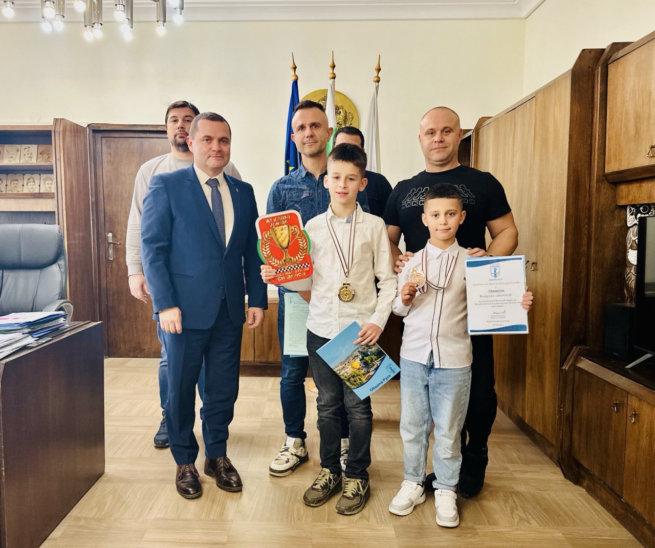 Кметът на община Русе Пенчо Милков се срещна с младите таланти по мотокрос Филип Кашов и Владиян Цветков, състезатели на СК „Годзила МХ“ – Русе. Те бяха отличени преди дни на годишната церемония на Българската федерация по мотоциклетизъм за сезон 2025.
