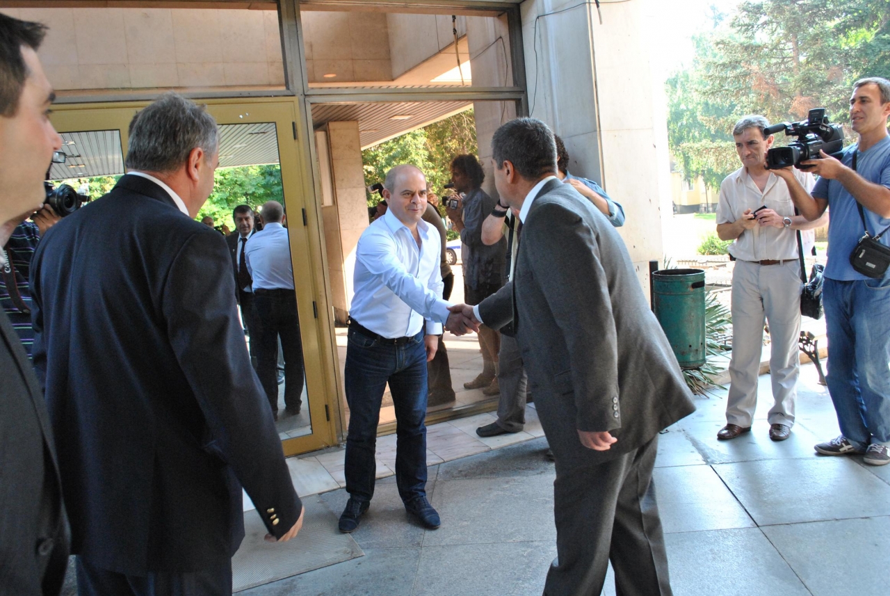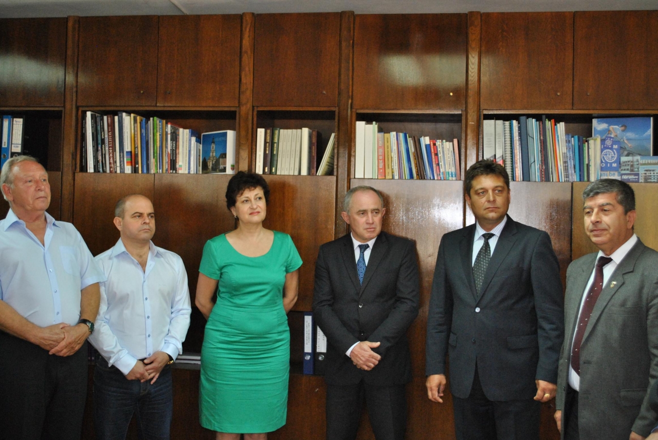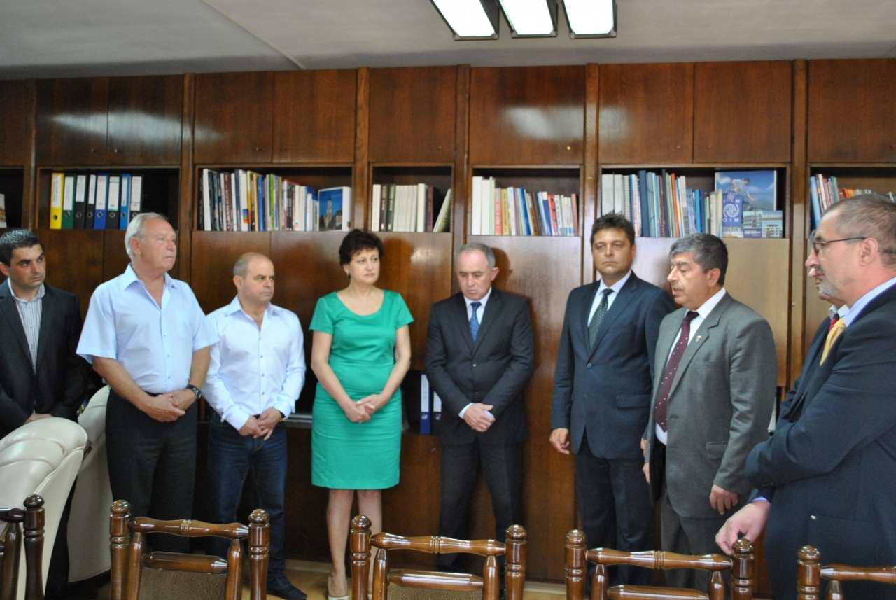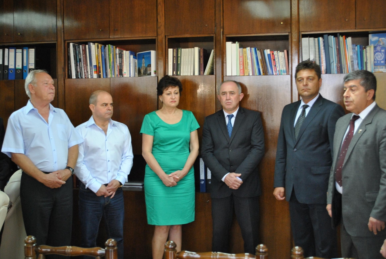 Кметът на Община Русе Пламен Стоилов приветства новия областен управител на Област Русе Венцислав Калчев по време на официалната церемония по встъпването му в длъжност, на която присъстваха бившият областен управител на Русе Стефко Бурджиев, временно изпълняващият длъжността областен управител д-р Андриан Райков, зам.-областният управител Веско Маринов, председателят на Общински съвет - Русе засл. професор Васил Пенчев, общинският съветник от БСП Александър Неделчев и народните представители от Коалиция за България в 19-и МИР - Русе Добрин Данев и Екатерина Заякова.