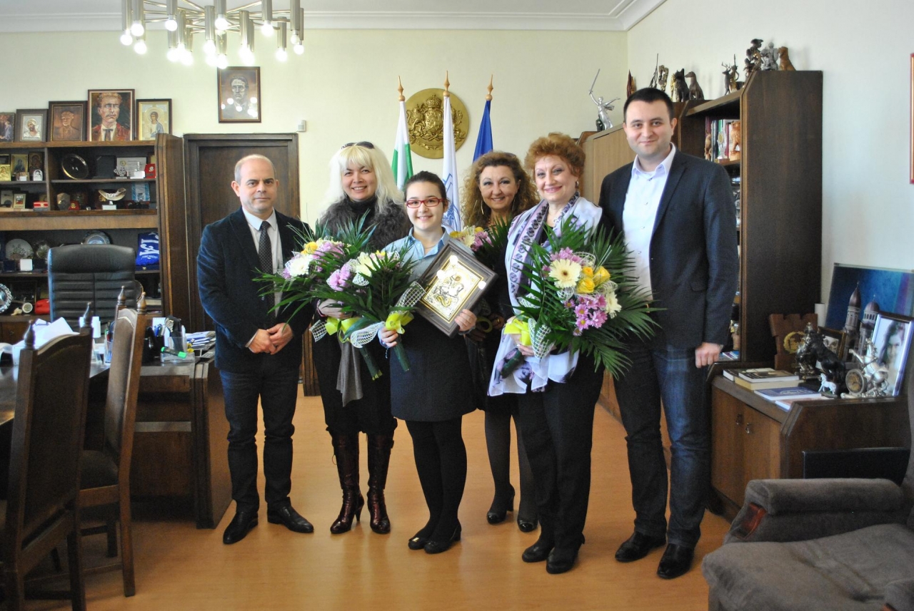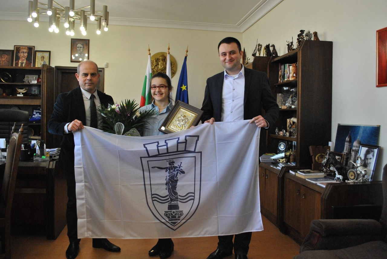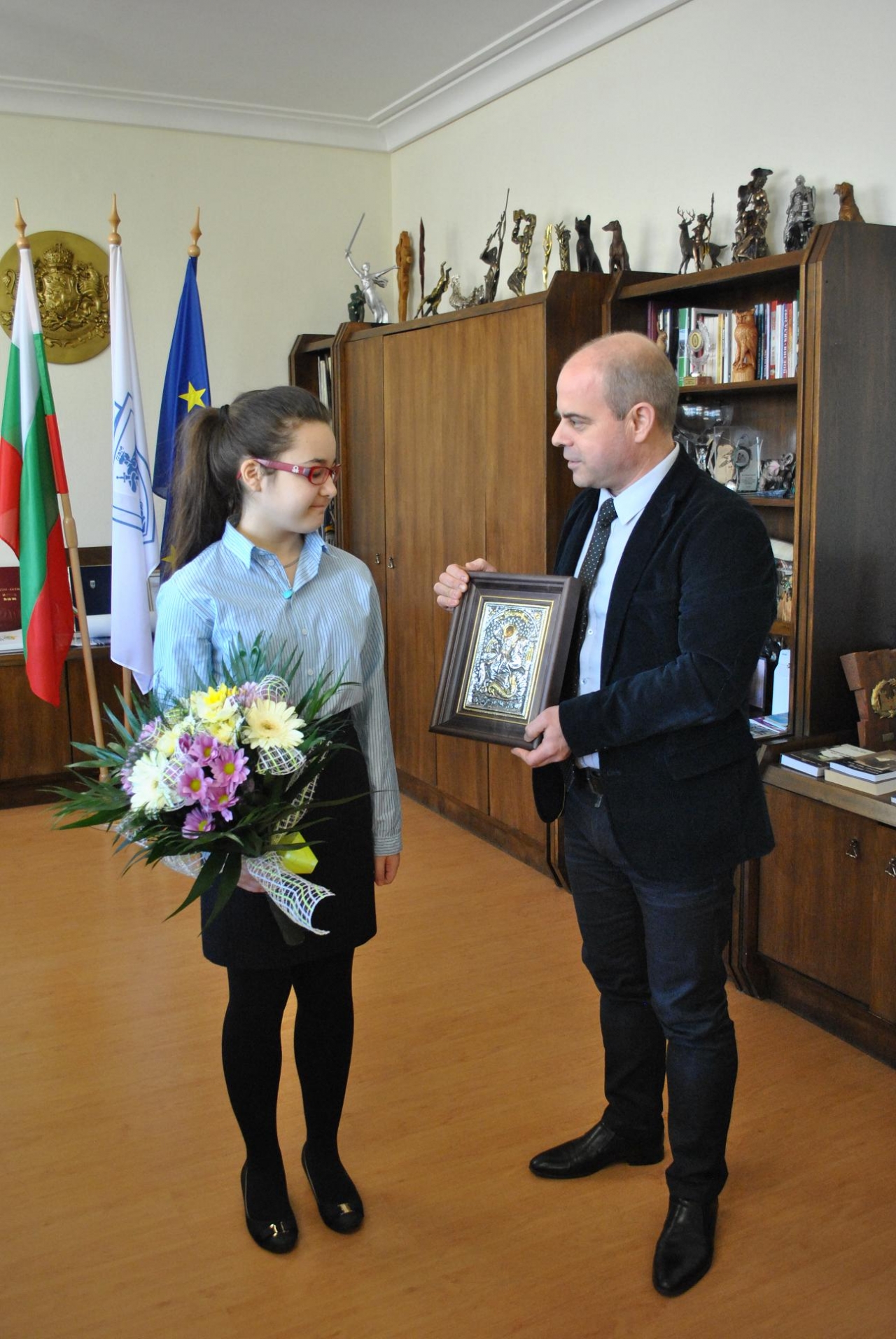 В края на срещата, г-н Стоилов поднесе на младата пианистка красив букет, знаме с герба на Русе и икона на Св. Георги Победоносец, която да я закриля и да й дава сили за много нови успехи.