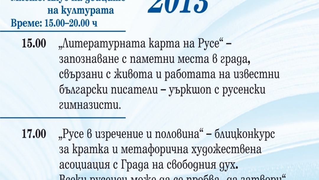 В 15 ч. ще започне уъркшоп с работно заглавие „Литературна карта на Русе”. Гимназисти от русенски училища ще се запознаят с паметни места в града, свързани с живота и работата на известни български писатели.