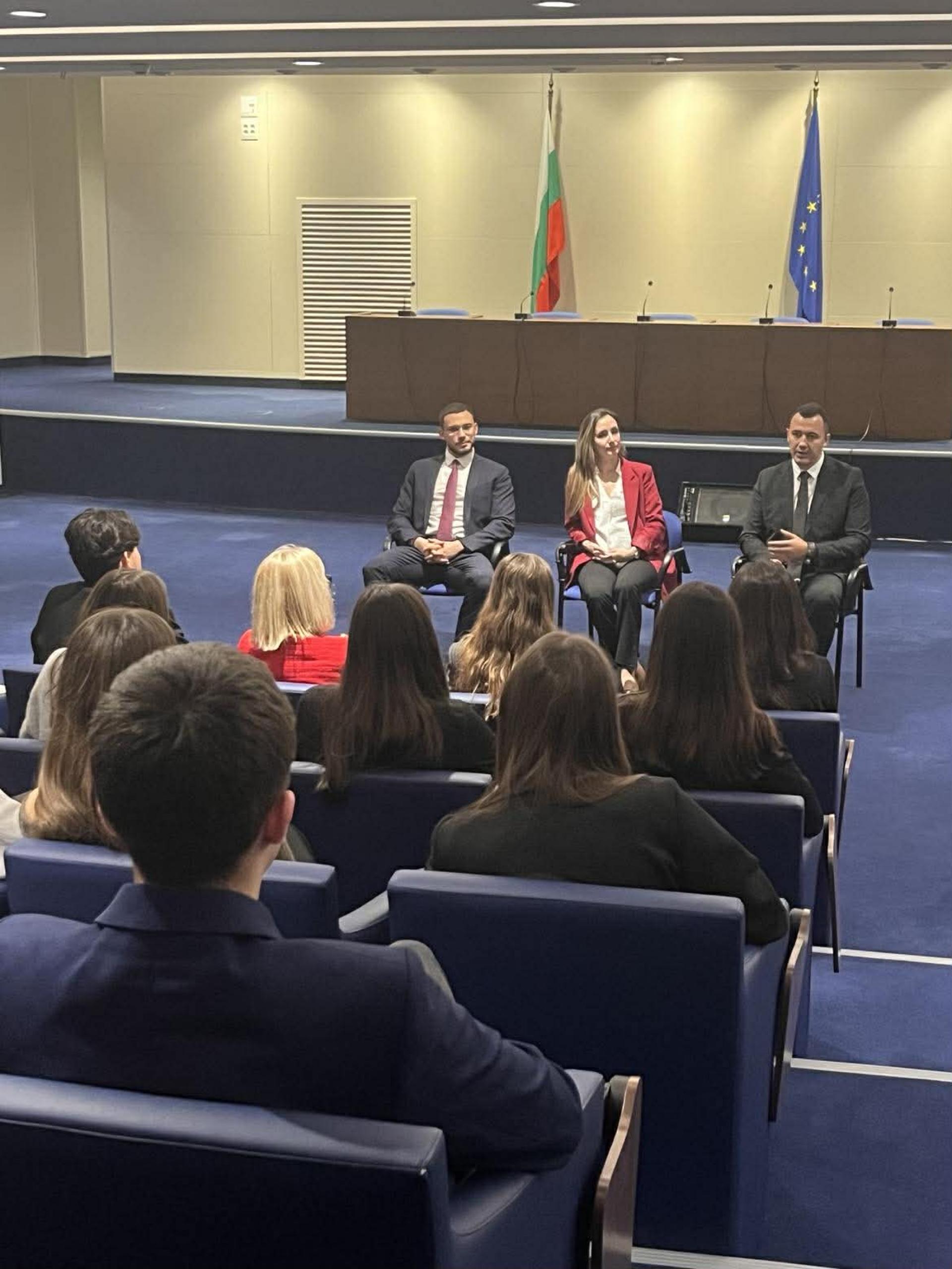 На 28 ноември участниците посетиха Народното събрание по покана на народния представител Биляна Иванова, която им организира среща и дискусия с още двама депутати – русенецът Георги Кръстев и председателят на Комисията по младежта и спорта в НС Габриел Кирилов. Младежите задаваха въпроси за работата на народните представители, за техните трудности, попитаха ги кога са разбрали, че искат да се занимават с политика, говориха за популизма, дезинформацията и фалшивите новини, които ни заливат в социалните мрежи.