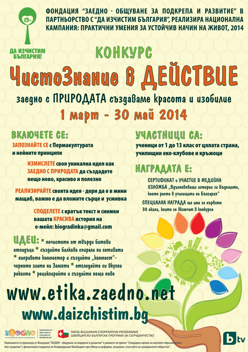 Фондация «ЗАЕДНО — общуване за подкрепа и развитие» отправя покана за участие в национален ученически конкурс на тема: "ЧистоЗнание в Действие". Той е част от националната кампания «Практични умения за устойчив начин на живот 2014», която фондацията реализира в партньорство с кампанията «ДА ИЗЧИСТИМ БЪЛГАРИЯ».