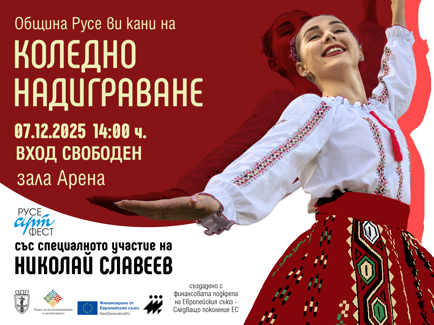 На 7 декември /неделя/ от 14 ч. за втора поредна година и при вход свободен в зала „Арена Русе“ ще се проведе традиционното Коледно надиграване. Звезда на тазгодишното издание на събитието ще бъде любимият народен изпълнител Николай Славеев, като специално за неговото представяне е подготвена авторска премиерна хореография.