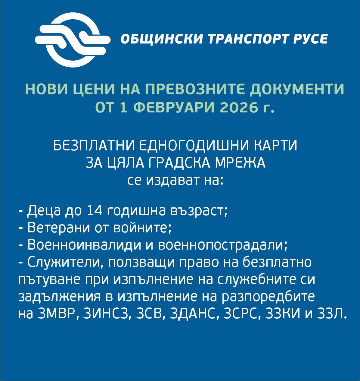 От 1 февруари влизат в сила нови цени на превозните документи за пътуване по автобусните и тролейбусните линии на „Общински транспорт Русе”. Целта на новата тарифа е да спести време на пътниците и да улесни работата с монети при покупка на билет от шофьора в превозното средство. Новата ценова политика е съобразена със Закона за въвеждане на еврото в Република България. В тази връзка, вместо директно превалутиране, цените на превозните документи имат леко намаление, за да се гарантира лесна и бърза обработка на плащанията в брой, без това да натоварва бюджета на гражданите.