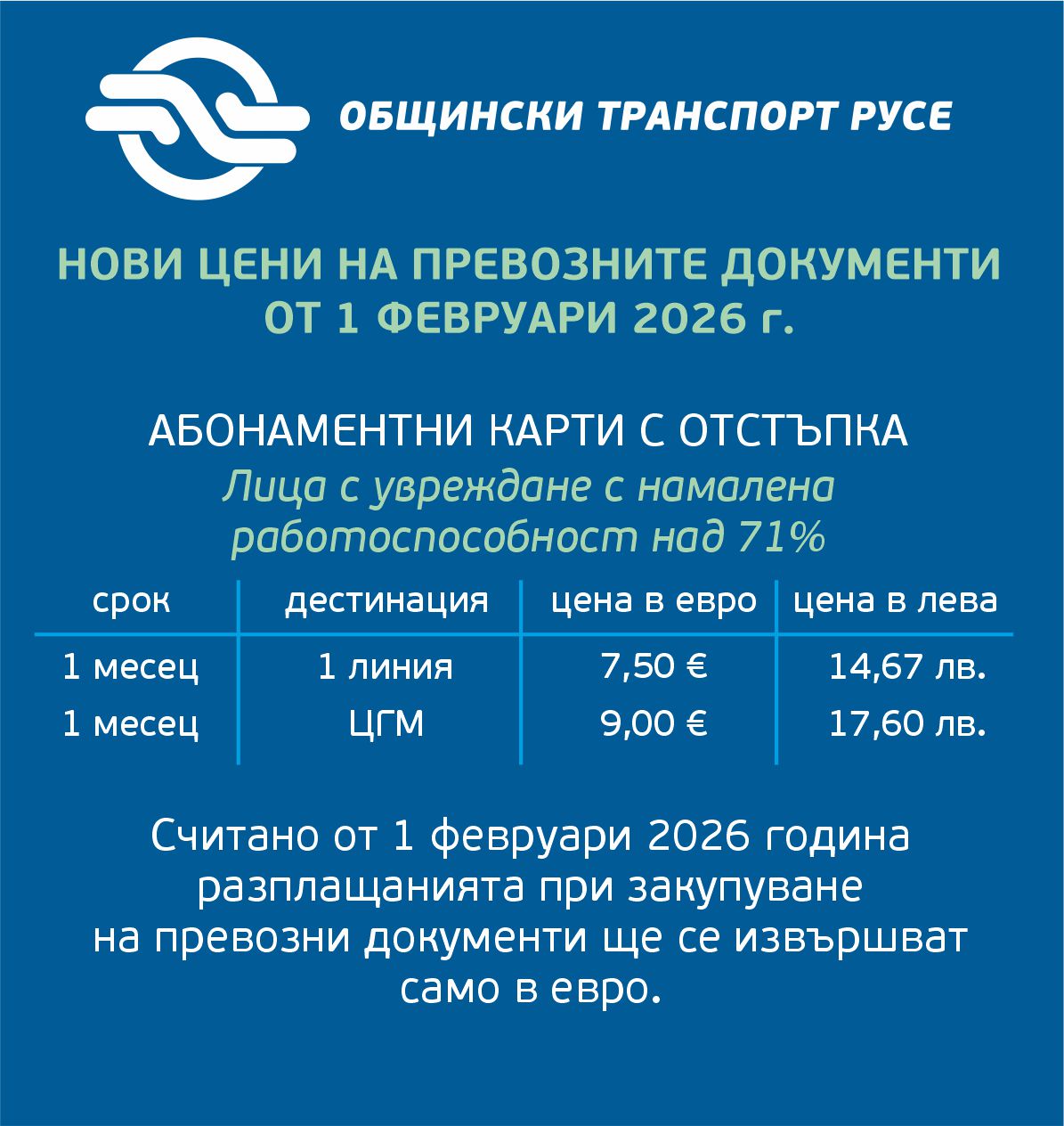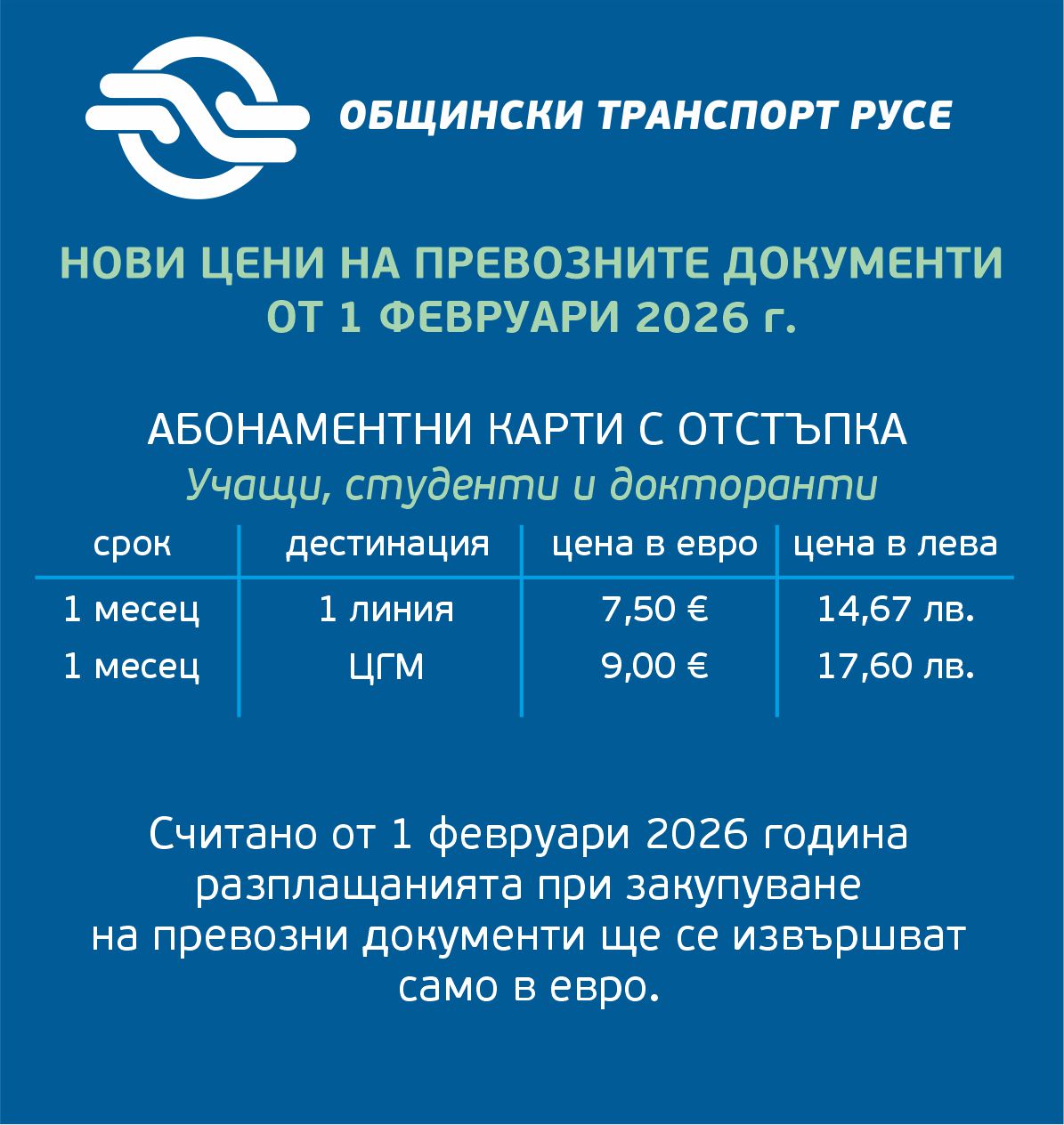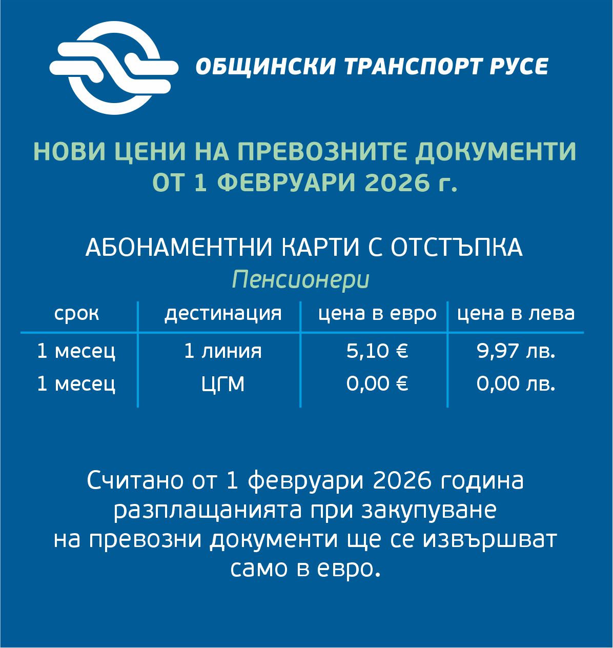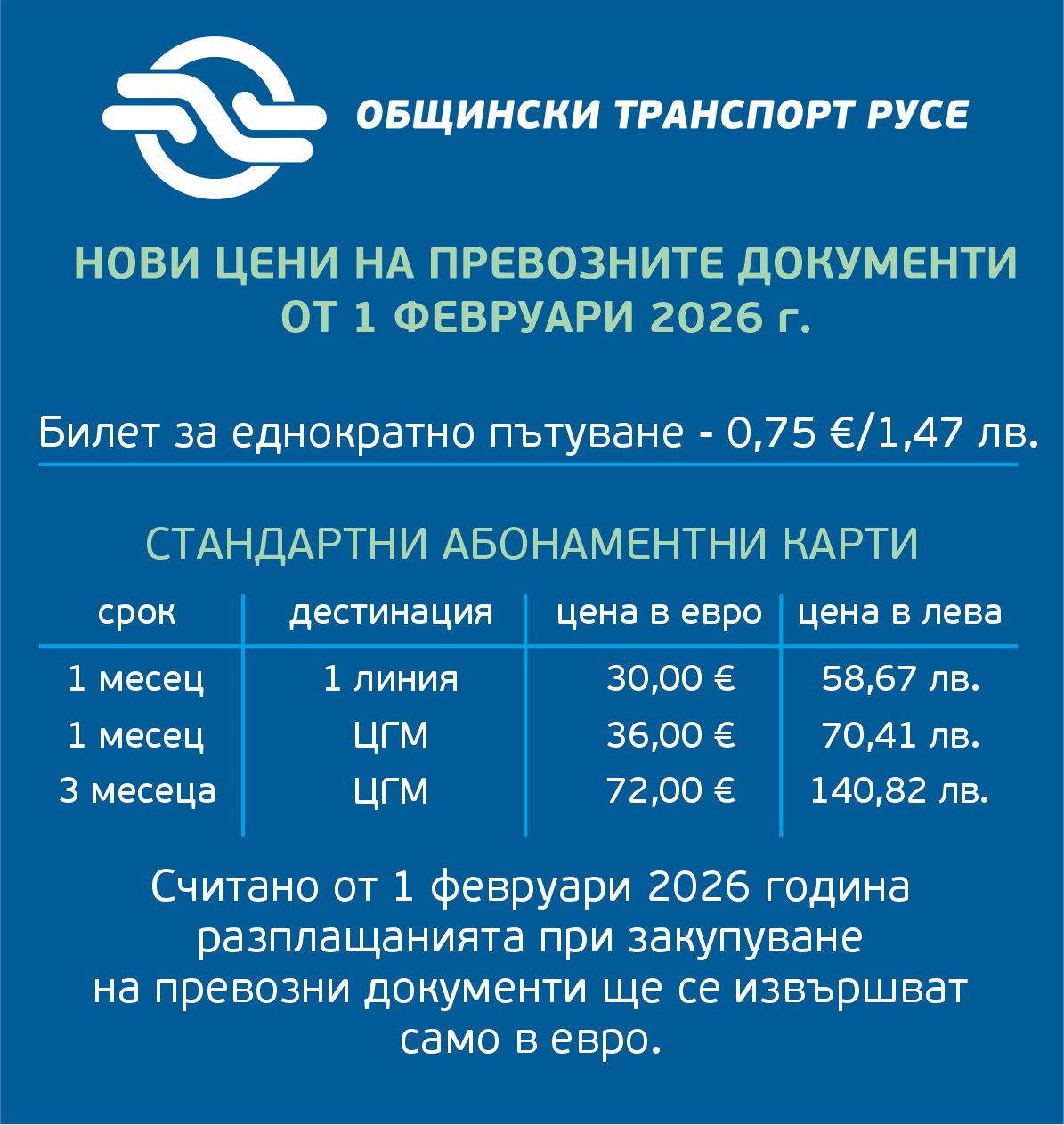 Превозни документи с новата цена ще могат да бъдат закупувани след 1 февруари. Напомняме, че считано от тогава разплащанията при закупуване на превозни документи ще се извършват само в евро. Водачите на превозните средства, както и служителите на Касовия и картовия център, няма да приемат плащания в лева. От дружеството призовават пътниците да се подготвят предварително, за да се избегнат затруднения и забавяне при обслужването.