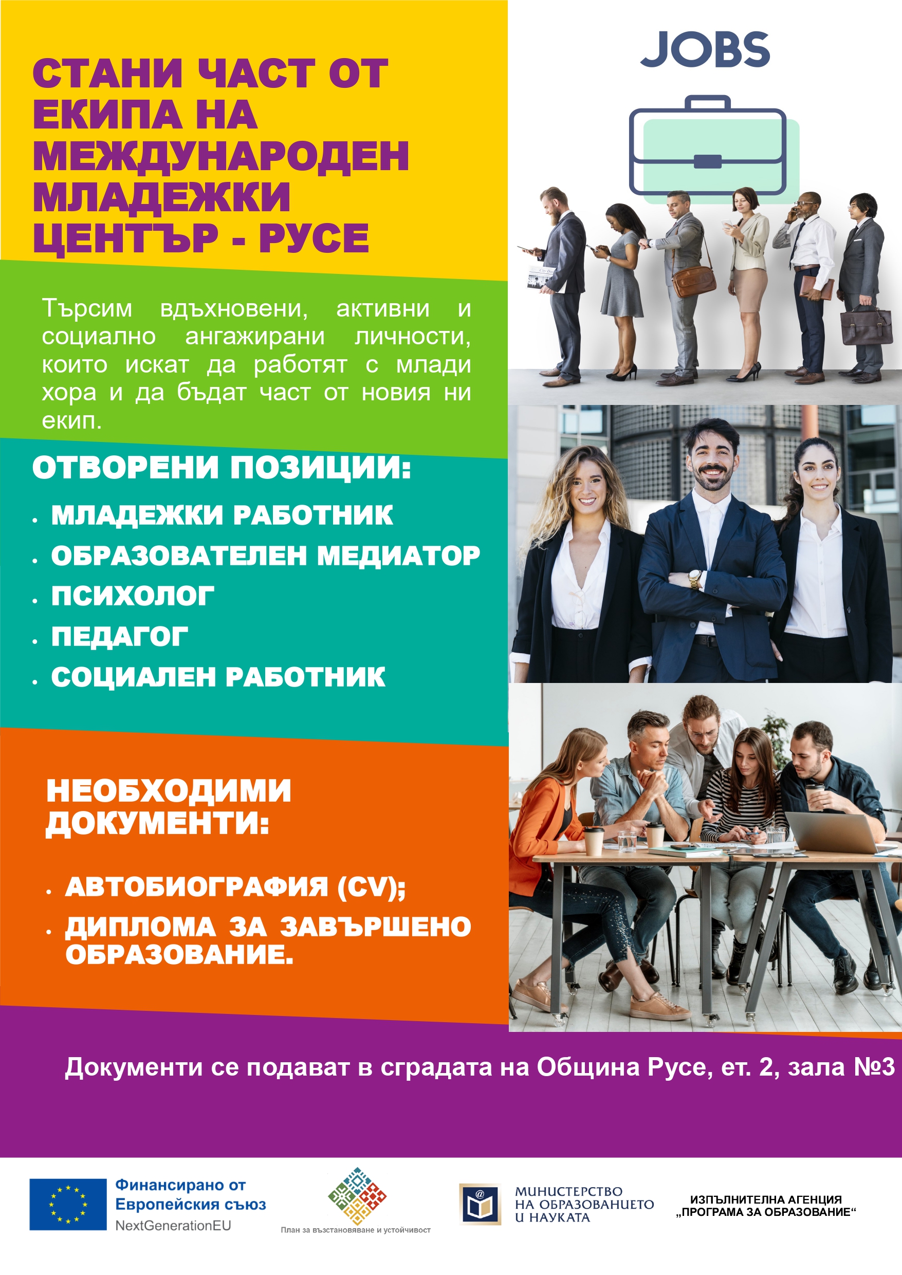 В тази връзка се търсят мотивирани и отговорни специалисти, които да се включат в изграждането на екипа на центъра. Позициите, за които се набират кандидати, включват младежки работници, образователен медиатор, психолог и педагог. Очаква се новите служители да имат интерес и опит в работата с млади хора, да притежават добри комуникационни и организационни умения и желание да допринасят за развитието на местната младежка общност.