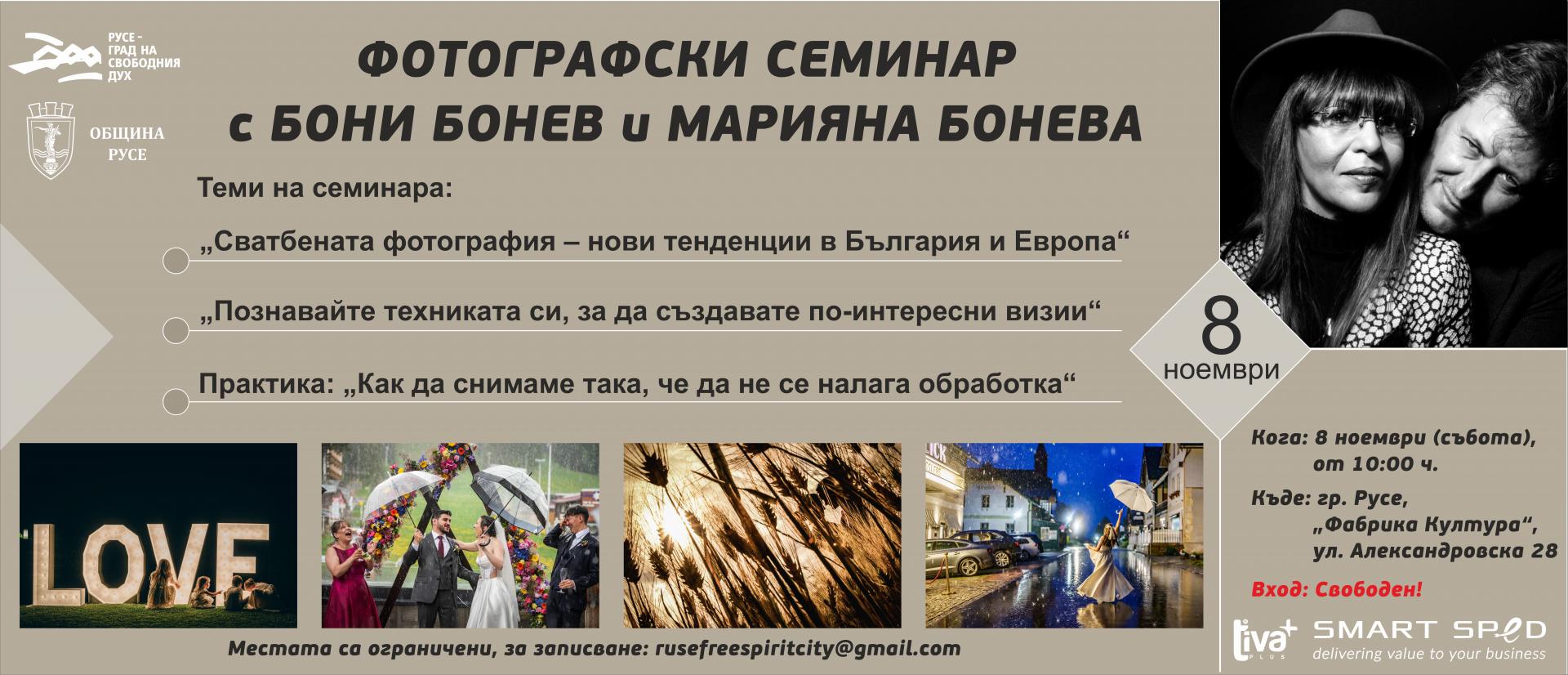 На 8 ноември /събота/ от 10 ч. във „Фабрика Култура“ /ул. „Александровска“ 28/ Общинска фондация „Русе – град на свободния дух“ организира фотографски семинар с Бони Бонев и Марияна Бонева – едни от водещите български фотографи. Събитието е с вход свободен и е отворено за всички – от любители до професионалисти – и предлага възможност за среща с едни от най-утвърдените имена във фотографията. Участието е безплатно, а поради капацитета на залата е необходима предварителна регистрация на имейл rusefreespiritcity@gmail.com .
