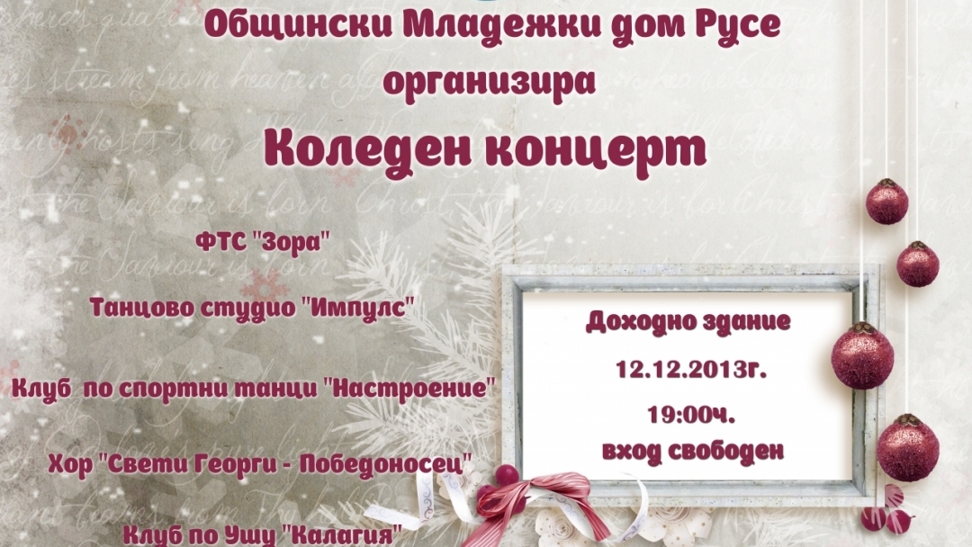 На 12 декември в Доходно здание Общинският младежки дом организира Коледен концерт. Събитието е с начален час 19:00 часа. Участие в него ще вземат Фолклорен танцов състав „Зора“, Танцово студио „Импулс“, Клуб по спортни танци „Настроение“, Хор „Свети Георги – Победоносец“, Клуб по ушу „Калагия“.