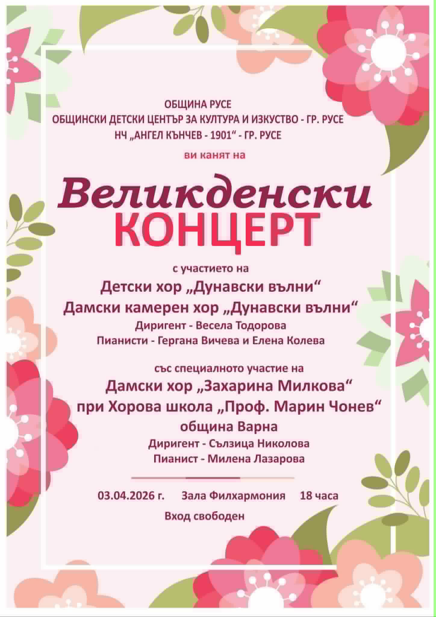 На 3 април от 18:00 ч. в зала „Филхармония“ Общинският детски център за култура и изкуство организира Великденски концерт. В него ще вземат участие Детски хор „Дунавски вълни“ и Дамски камерен хор „Дунавски вълни“ при НЧ „Ангел Кънчев – 1901“. Диригент на формациите е Весела Тодорова, а пианисти - Гергана Вичева и Елена Колева.