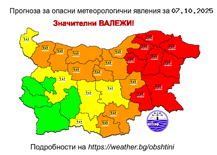 Синоптиците от Националния институт по метеорология и хидрология предупреждават за опасни метеорологични явления в община Русе. Издаден е оранжев код за значителни продължителни валежи за утре, 7 октомври. За 24 ча́са се очаква количеството на валежите да достигне между 45 и 60 мм.