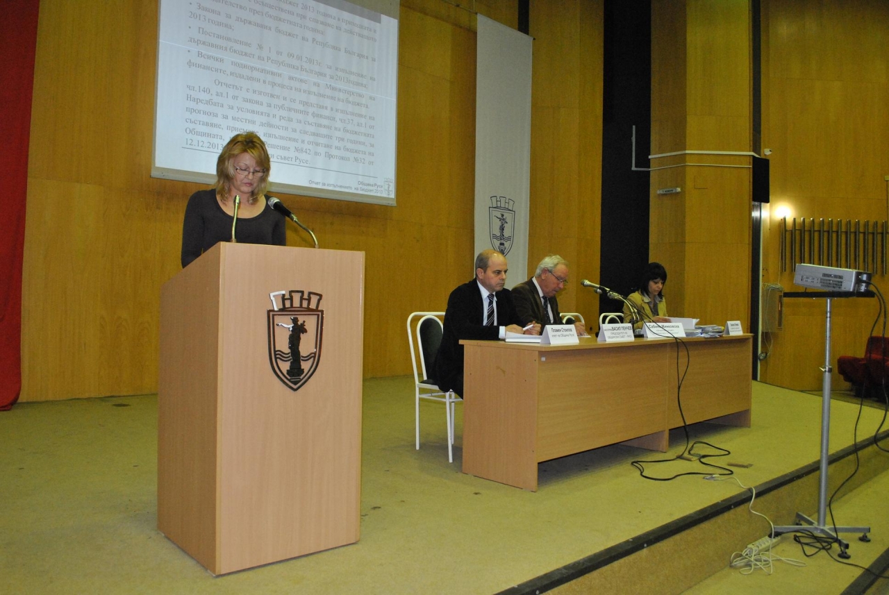 Началникът на отдел „Финансово-стопански” в Община Русе Сабина Минковска представи Отчета за изпълнението на Бюджета на Община Русе за 2013г. Г-жа Минковска отбеляза, че през 2013г., спрямо 2012г., има увеличение по прихода в размер на 16 246 224лв. Изпълнението на собствените приходи към 31.12.2013г. е с 2 798 968лв. по-високо от същото към 31.12.2013г. Към 31.12.2013г. Община Русе няма просрочени задължения.