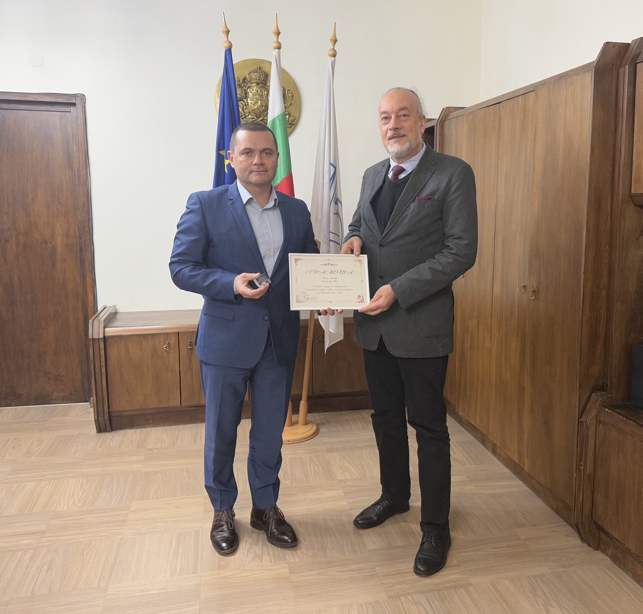 В края на срещата оперният директор връчи на кмета почетен кристален знак и грамота с благодарност и признателност за цялостна подкрепа, доверие и принос към развитието на Държавна опера – Русе.