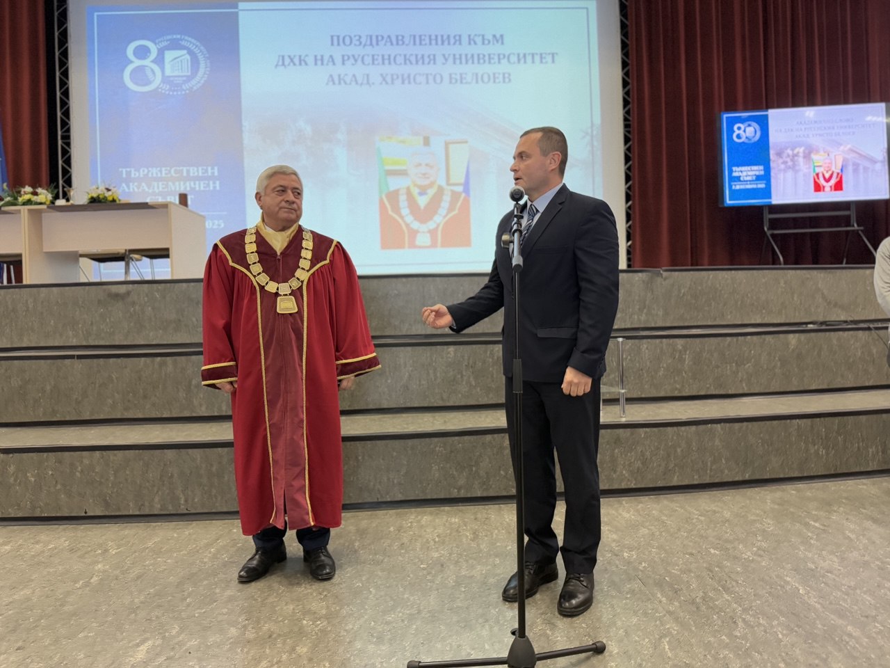 Кметът поднесе на акад. Белоев почетен плакет и поздравителен адрес в знак на признателност за неговата многогодишна дейност и принос за утвърждаването на Русе като университетски град и образователен център на Северна България. „В една епоха, когато истинските ценности понякога остават в сянка, Вашият пример напомня на всички нас, че превъзходството се постига с упорит труд, интегритет и постоянство. Благодаря Ви, че с Вашите знания възпитавате младите в любов към образованието и науката, с Вашата мъдрост мотивирате хората да създават и да отстояват своята гражданска позиция, а с Вашата дипломатичност успявате да обедините в името на обществото хората, които мислят различно“, заяви Милков.