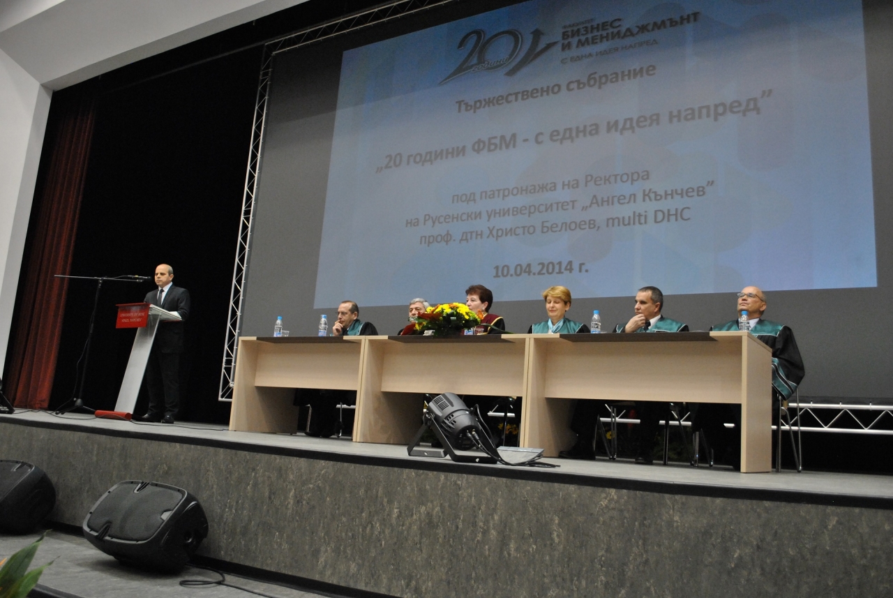 Честванията по повод 20 години Факултет „Бизнес и мениджмънт“ продължиха с Тържествено събрание и приветствия от декана на факултета доц. Емил Трифонов. Ректорът на университета проф. Христо Белоев поздрави присъстващите и връчи на декана Плакет на Русенския университет и сумата от 5000 лева.