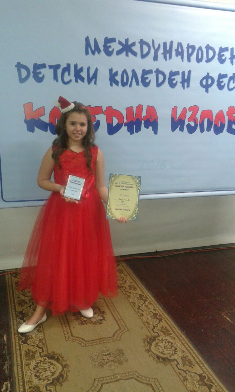 Десетгодишната Полина Георгиева очарова журито с песента "Коледна приказка" на Св. Лобошки и заслужено спечели първа награда. Малките артисти се състезаваха в шест възрастови групи и успяха да превърнат деня в празник на хубавата българска коледна песен. Талантливото дете e възпитаник на Вокална студия ,,Слънчеви ноти'' с ръководител Наталия Константинова.