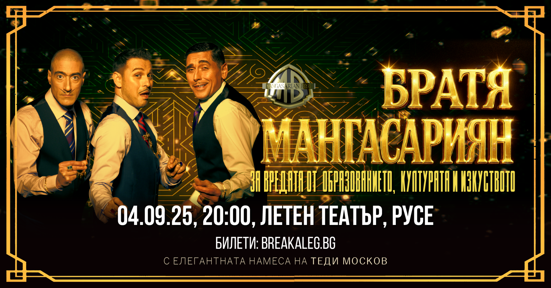 На 4 септември /четвъртък/ в 20 ч. на сцената на Летния театър популярното трио Братя Мангасарян ще провокира русенци и гости на града с комедийния мултимедиен спектакъл „За вредата от образованието, културата и изкуството“. Събитието се осъществява с подкрепата на Община Русе.