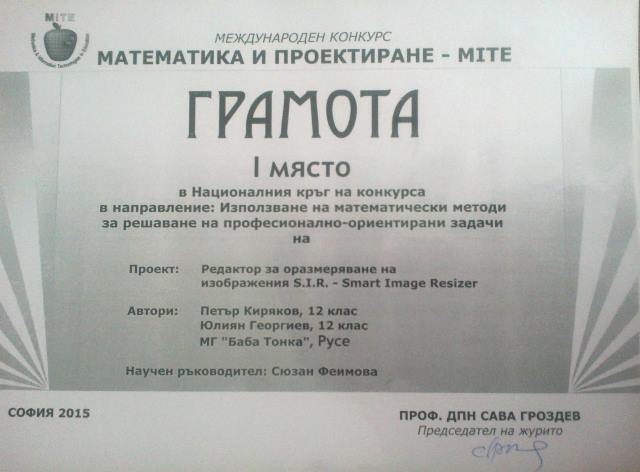 Младите русенски математици Юлиян Георгиев и Петър Киряков завоюваха Първо място в направление „Използване на математически методи за решаване на професионално-ориентирани задачи”с подобрена версия на проекта си „Редактор за оразмеряване на изображения S.I.R. – Smart Image Resizer”. Момчетата са поканени да участват в Международния кръг на конкурса, който ще се проведе в началото на месец май в Москва.