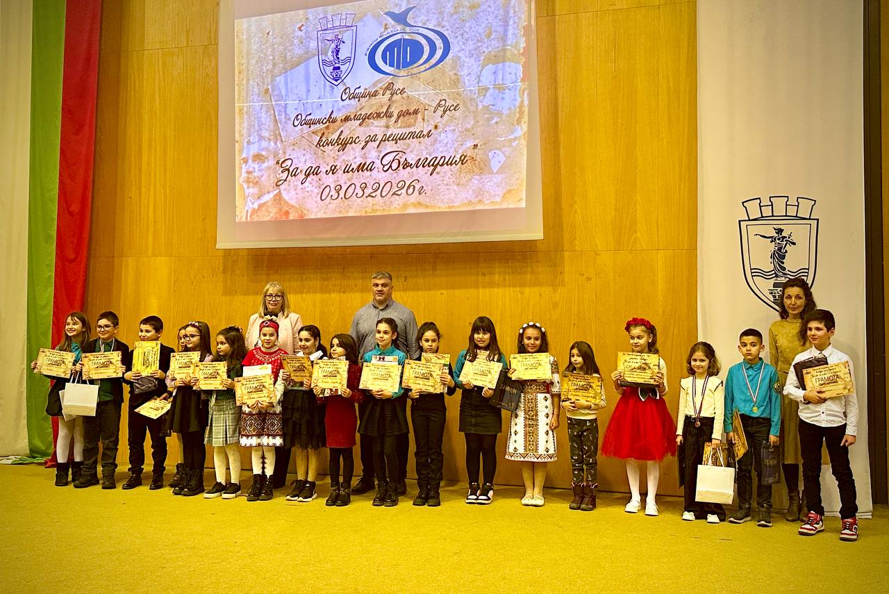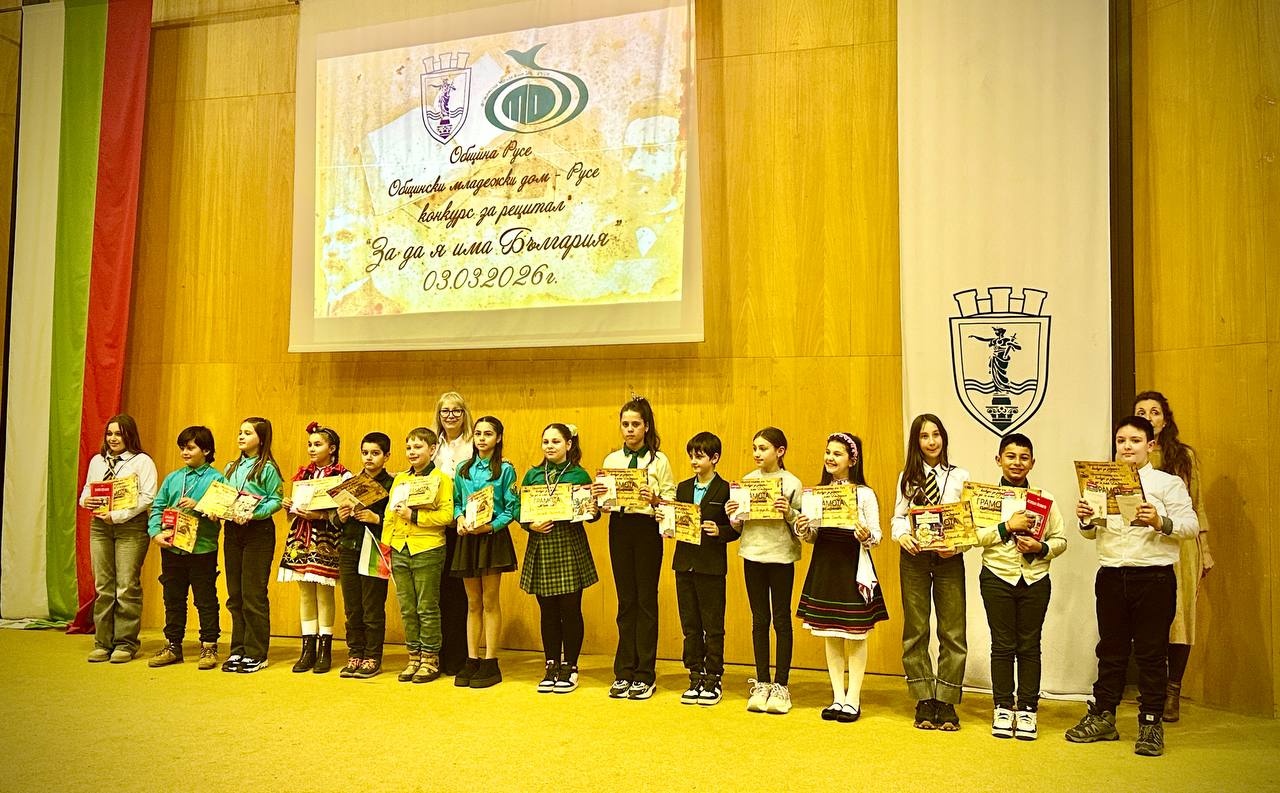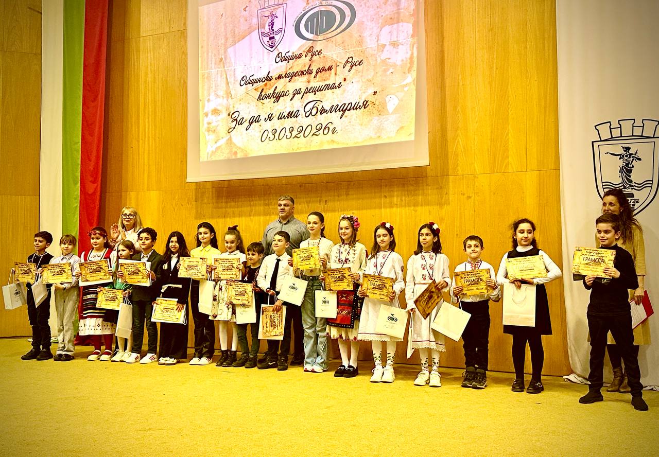 На тържествена церемония в Пленарна зала на Община Русе бяха връчени наградите на победителите от конкурса рецитал „За да я има България“. Събитието се провежда за 22-и път в чест на националния празник 3 март и се организира от Общинския младежки дом. Гост на церемонията по награждаване бе заместник-кметът Борислав Рачев, който връчи наградите в част от категориите.