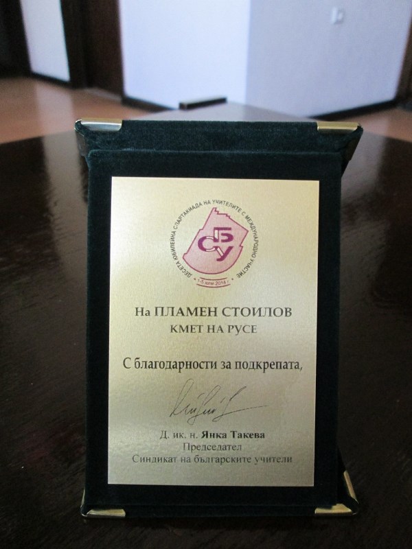В знак на благодарност за оказаната подкрепа в подготовката за състезанието, кметът Стоилов получи благодарствен плакет от името на председателя на Синдиката на българските учители Янка Такева.