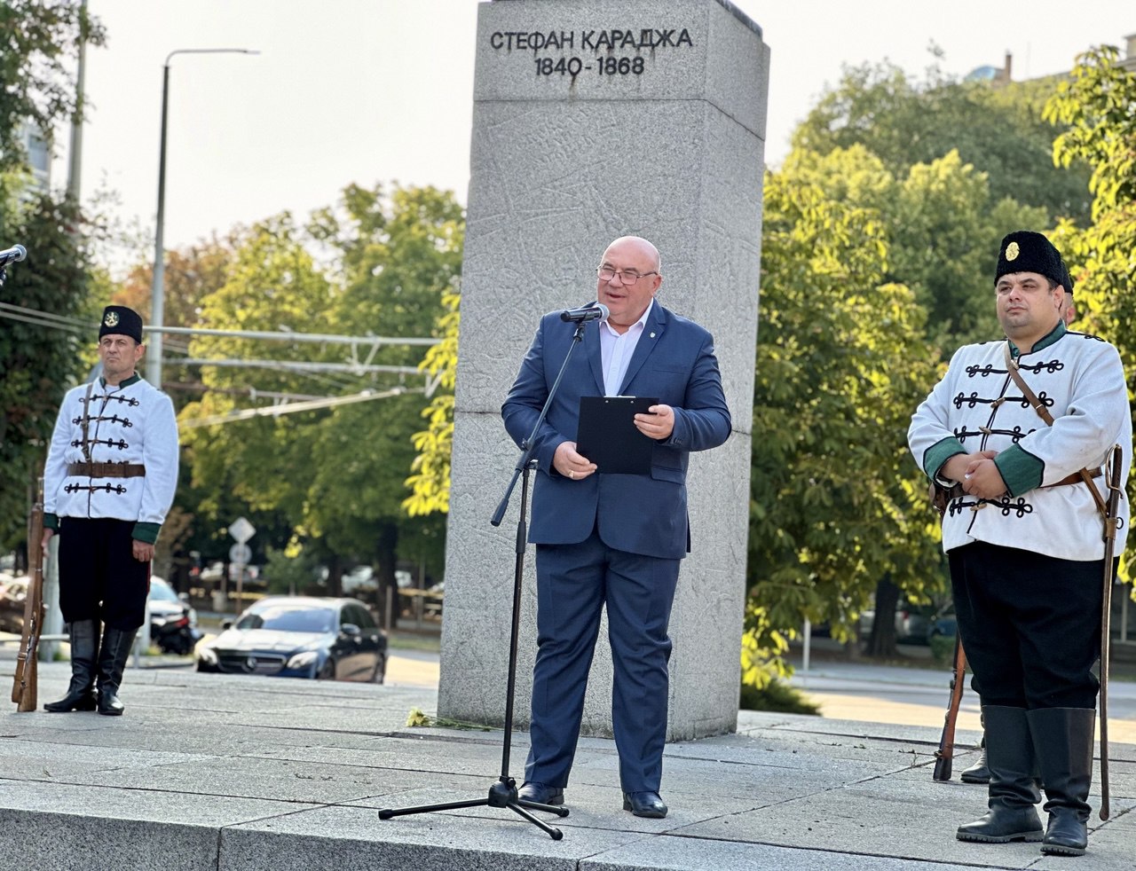 „В ден като днешния отдаваме почит на един от най-светлите и неустрашими образи в българската национално-освободителна история – Стефан Караджа. Той е от онези личности, които не се побират в портрети и дати, защото животът му сам по себе си е символ на безкомпромисна отдаденост на свободата. Загинал едва 28-годишен, той остава пример за сила на духа, саможертва и непоколебима вяра в правото на народа ни да живее свободно и достойно“, отбеляза в словото си зам.-кметът Енчев. Той подчерта, че Стефан Караджа не е част от миналото само като исторически факт – той е морален ориентир, който ни напомня, че свободата не е даденост, а отговорност. „Нека не оставяме делото на Стефан Караджа да звучи само в речите на годишнини, а да го усещаме в решенията си като граждани, в начина, по който възпитаваме децата си, в усилията си да бъдем общество със съзнание и памет”, каза още Енчев. Той допълни, че Община Русе подкрепя инициативата на посланика ни в Румъния – Н. Пр. Радко Влайков, за изграждане на бюст-паметник на революционера в град Тулча – днешна румънска територия, която по онова време е част от Северна Добруджа, и където Стефан Караджа е живял в продължение на години. Планира се паметникът да бъде открит до края на годината в парка „Пиаца ноу”, в близост до църквата „Св. Георги“.