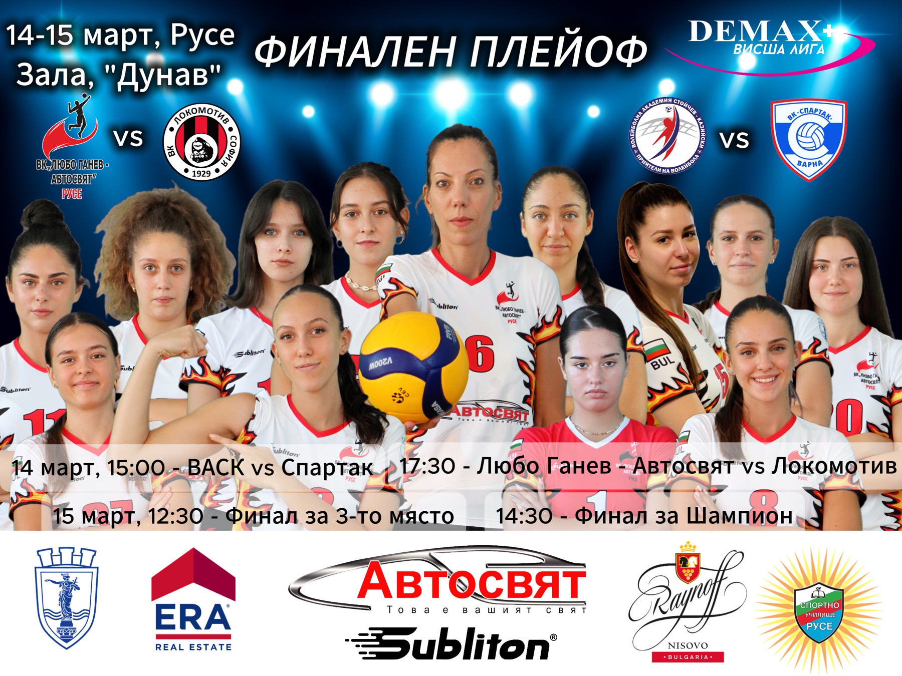 Русе ще бъде домакин на финалната четворка (плейофи) в първото историческо издание на шампионата Демакс+ Висша лига по волейбол при жените. Полуфиналите и финалите на надпреварата ще се проведат на 14 и 15 март в зала „Дунав“, а домакин на турнира е местният волейболен клуб Любо Ганев - Автосвят.