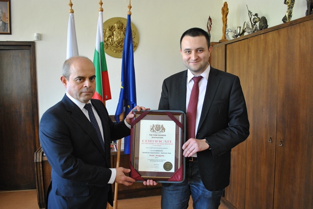Днес, след завръщането си от английската столица, д-р Карапчански връчи официално наградата на кмета Пламен Стоилов. Сертификатът намери достойно място в кабинета на градоначалника.