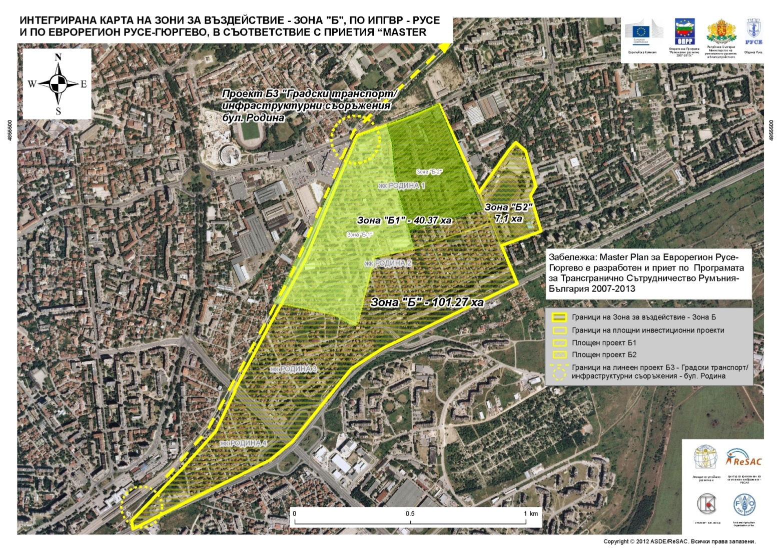 1. Зона Б – зона с преобладаващ социален характер, с териториален обхват: на северозапад - ЖП линията за централна гара, включително частта от ул.”Шипка” до кръстовището на Кооперативния пазар бул.”Липник”, ул.”Тича” и продължението и до бул. “България” (включително и терена на Спортен комплекс „Дунав”), бул.”България” до района на ЖП гара (включват се ж.к. „Родина“ от 1 до 4);