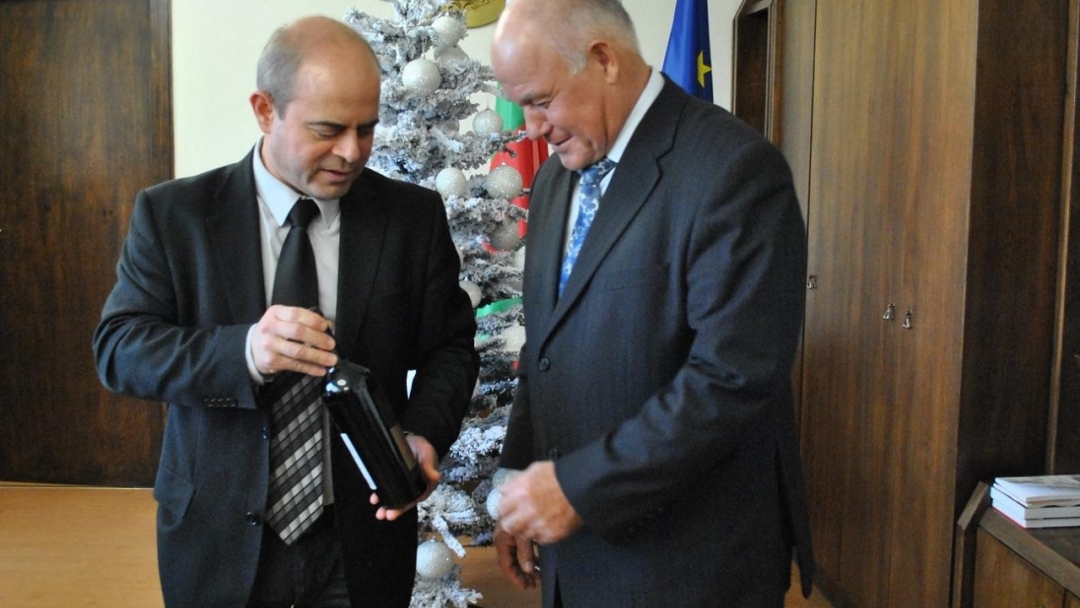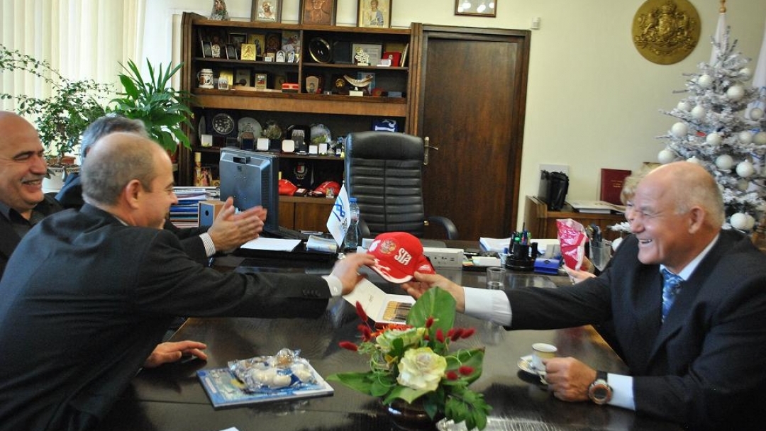 Наред с албум за училището, гостите поднесоха като подарък на г-н Стоилов оригинална шапка от официалния спортен екип на руските национали.
