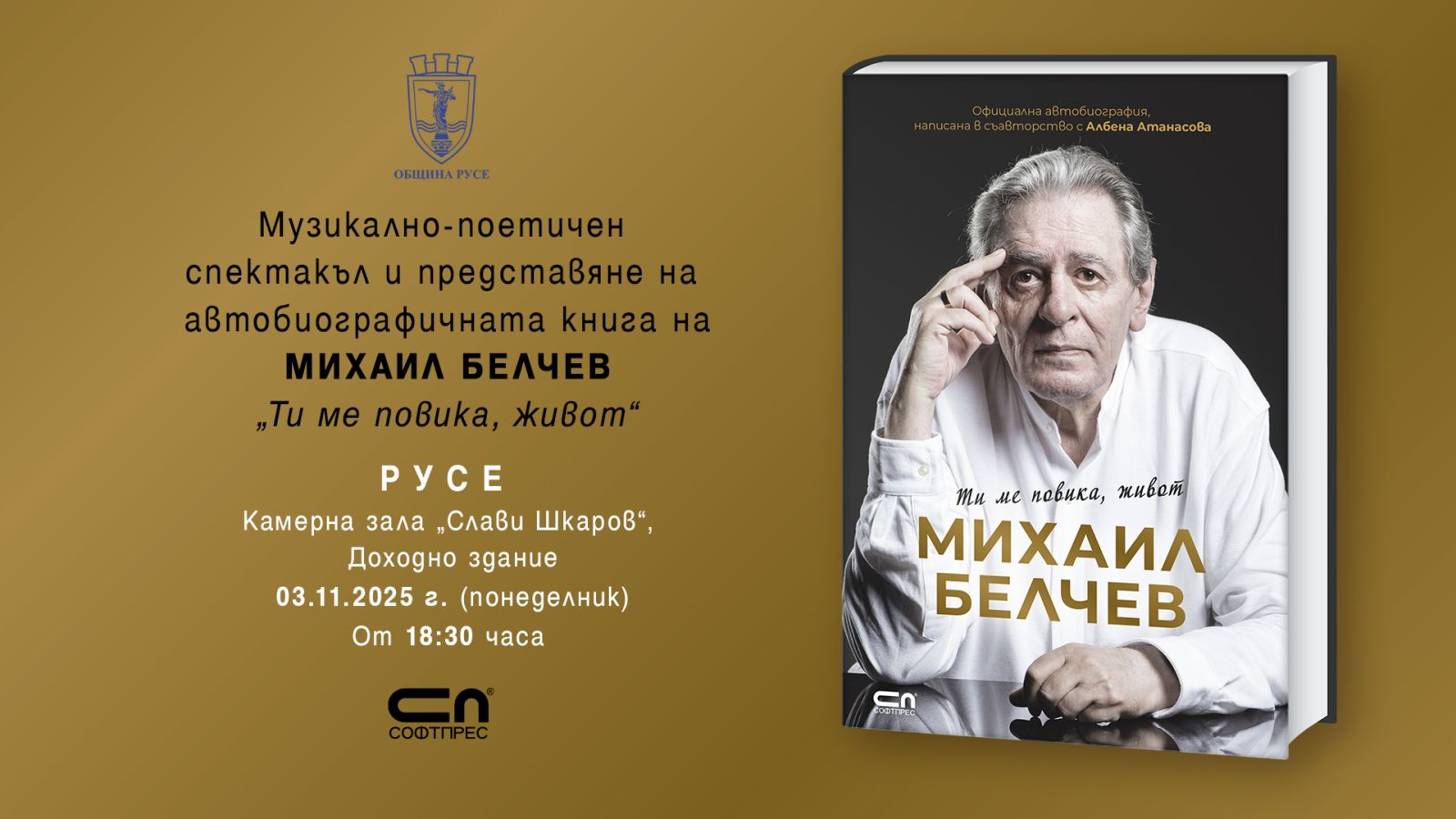 Община Русе организира на 3 ноември /понеделник/ от 18:30 ч. в Камерна зала „Слави Шкаров“ на Доходното здание музикално-поетичния спектакъл и премиера на автобиографичната книга на Михаил Белчев "Ти ме повика, живот". В изпълнение на известния бард и неговата съпруга, актрисата и певица Кристина Белчева, ще прозвучат и някои от най-емблематичните песни „Не остарявай, любов“, „Булевардът“, „В полумрака на спомена“ и др.