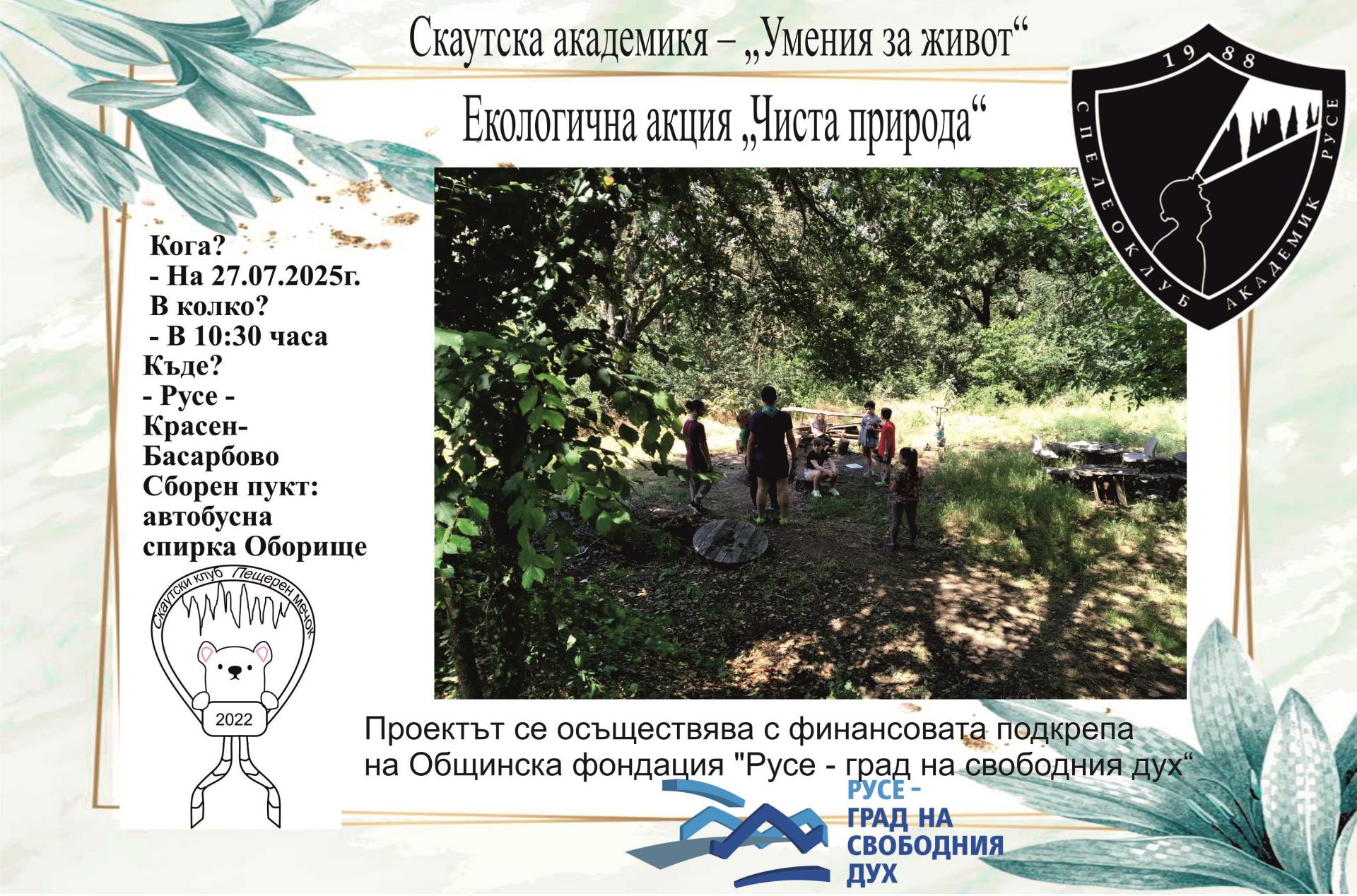 На 27 юли /неделя/ ще се проведе втората инициатива от проекта "Скаутска академия – Умения за живот“ на Спелео клуб „Академик – Русе“, подкрепен от Общинска фондация „Русе – град на свободния дух“. Екологичната акция под наслов „Чиста природа“ ще събере деца и младежи от Русе в една вдъхновяваща и полезна мисия – почистване на екопътеката от с. Красен до с. Басарбово и брега на река Русенски Лом.