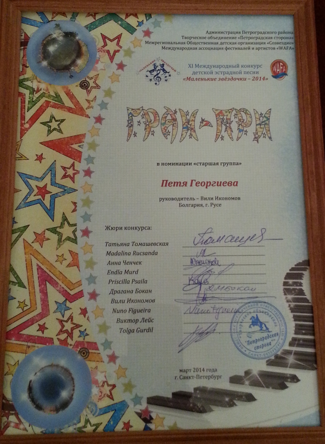 Младата русенска изпълнителка Петя Георгиева спечели Гран При на ХІ-тото издание на Международния конкурс за детски естрадни песни "Маленькие звездочки", състоял се от 19 до 24 март в Санкт Петербург, Русия. За първи път голямата награда на конкурса се печели от представител на България. Талантливото момиче се конкурира с повече от 20 изпълнители от 12 държави във втора възрастова група - от 9 до 12 годишна възраст.