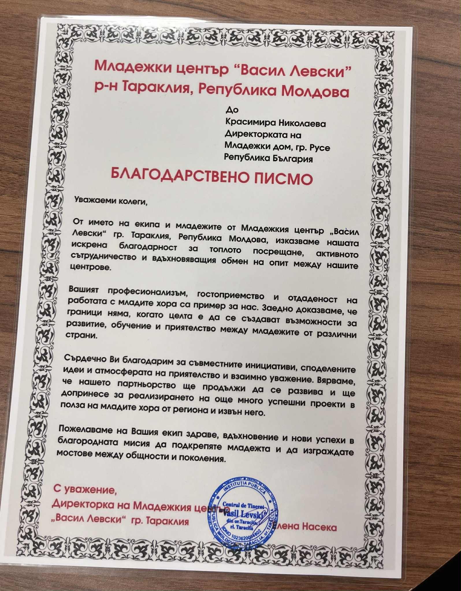 Директорът на Общинския младежки дом Красимира Николаева запозна гостите с институцията и ги разведе из сградата й. В разговорите след това бяха обсъдени възможности за бъдещо сътрудничество и обмен на добри практики. Николаева получи благодарствено писмо и плакет от директора на Младежкия център в Тараклия.