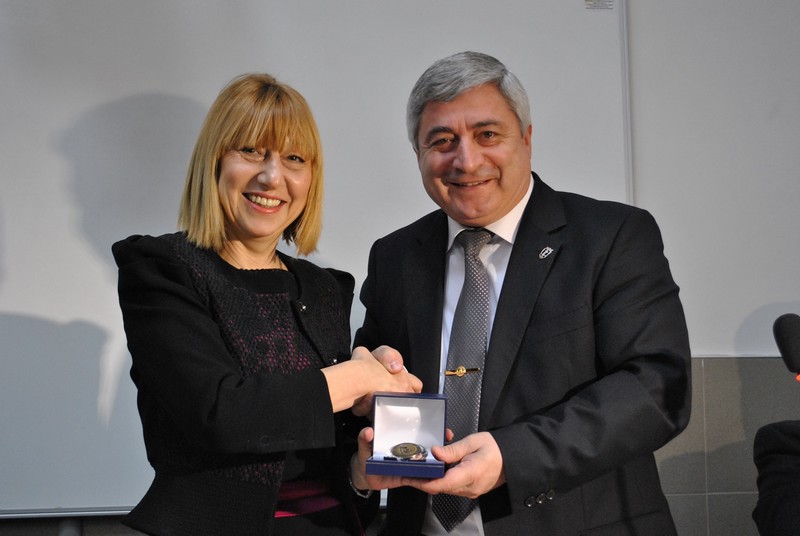Проф. Христо Белоев удостои министър Клисарова с Кристалния знак на Русенския университет. Подари й и картина с пейзаж от централната градска част на Русе.
