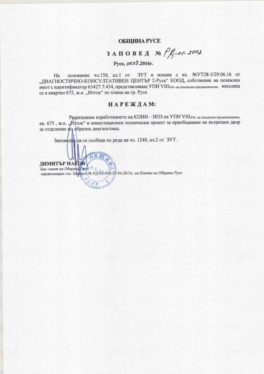ЗАПОВЕД № РД-01-2002/01.07.2016 г.