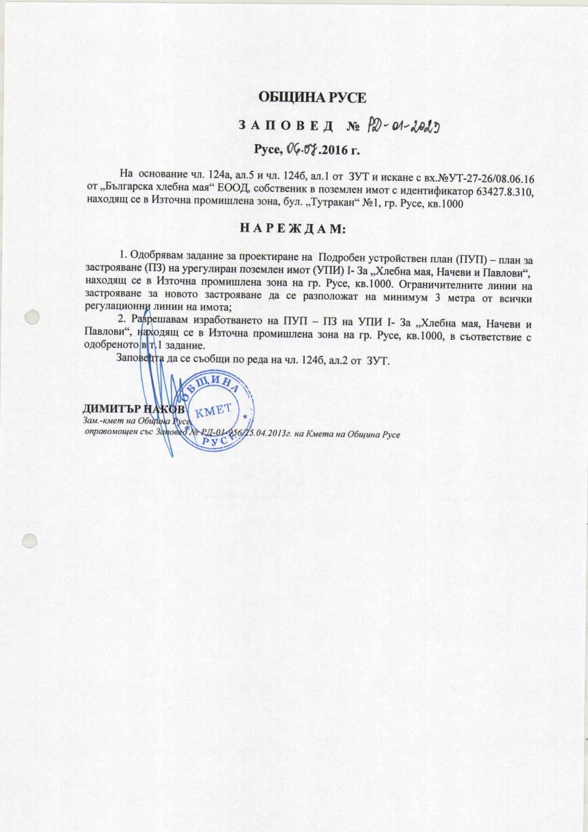 ЗАПОВЕД № РД-01-2023/06.07.2016 г.